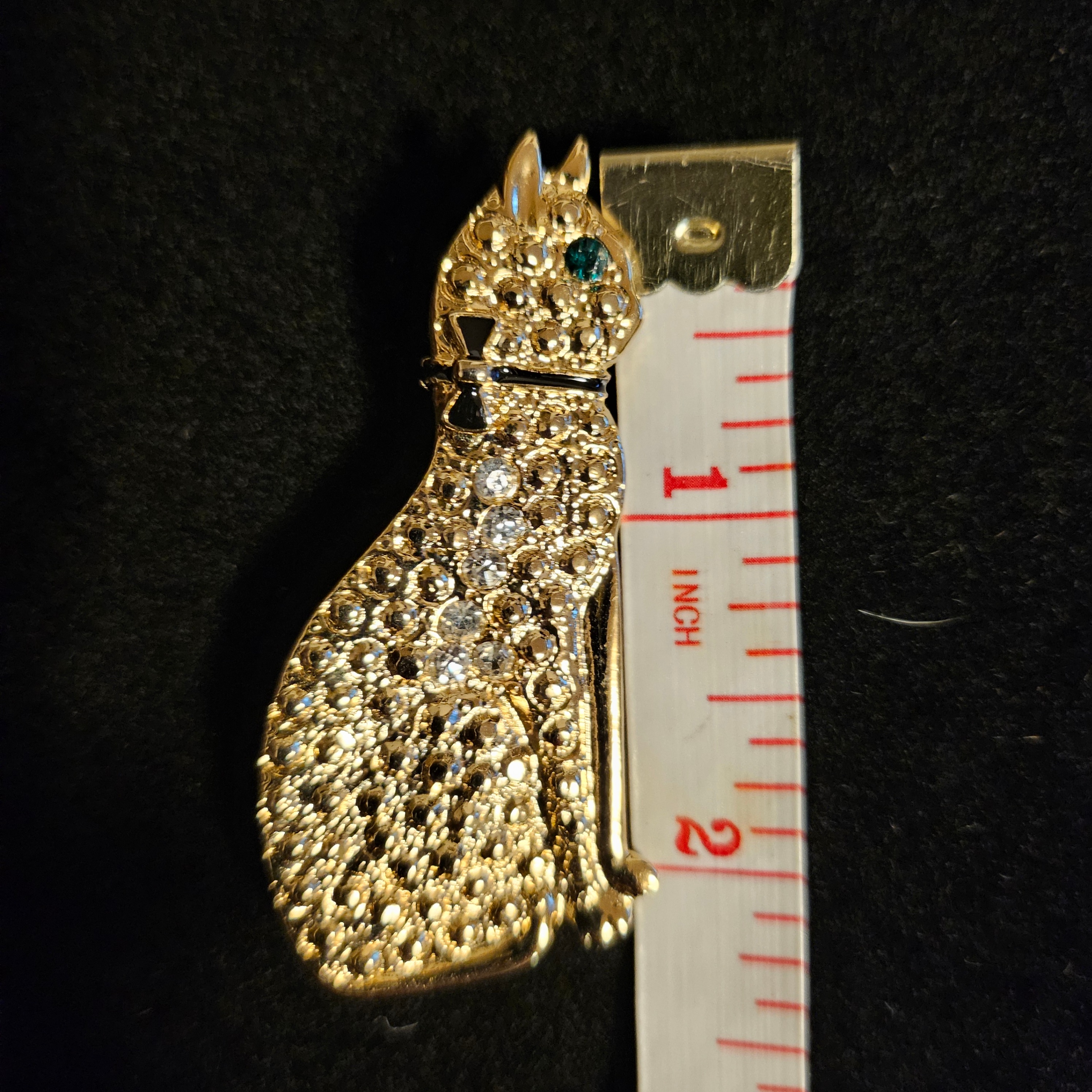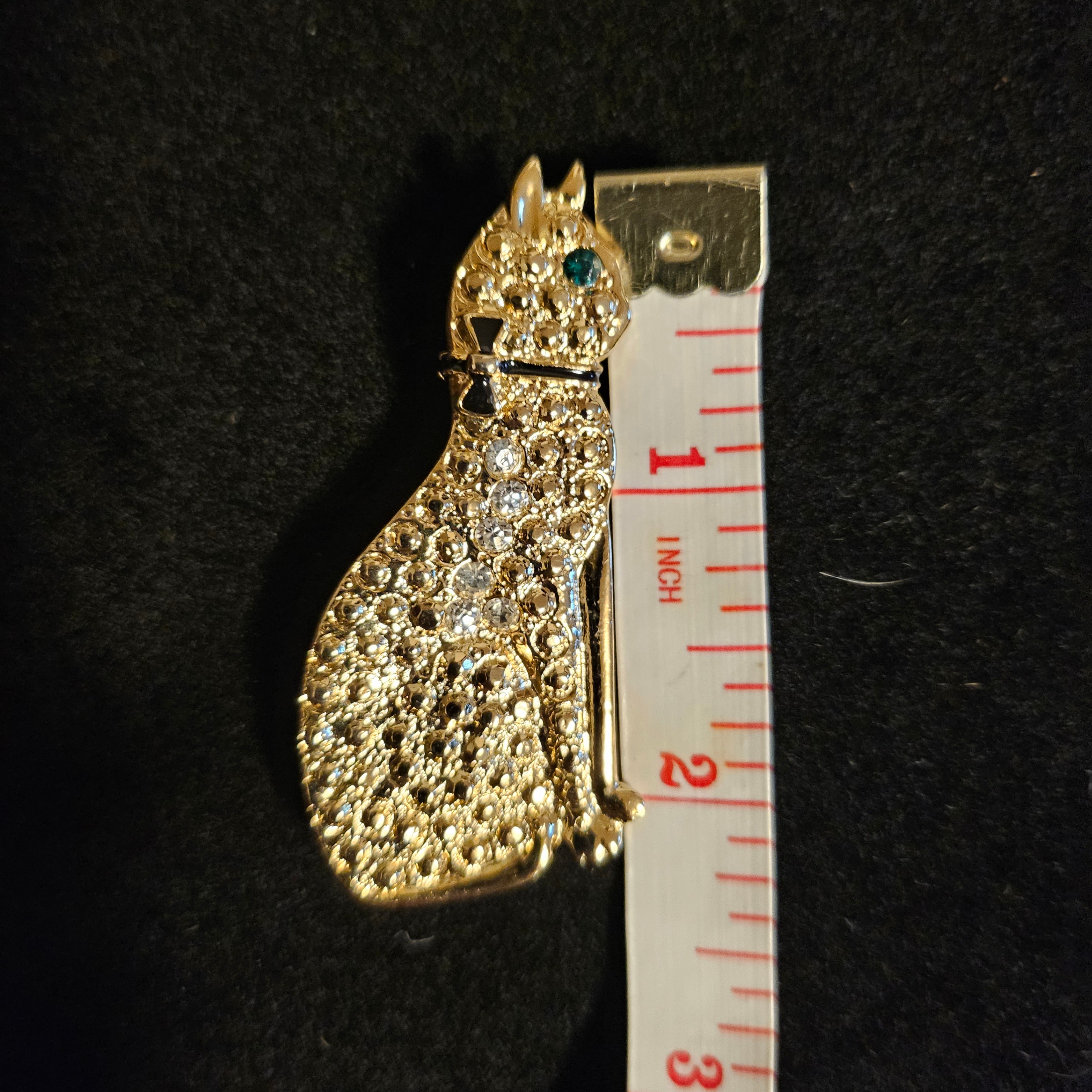 This is a cat pin, gold in colour and adorned with crystals and an emerald coloured eye. It is approximately 2 inches in length and in good condition.