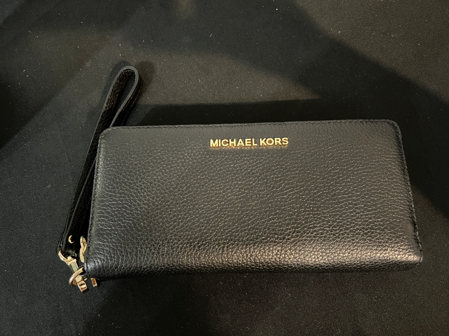 New, never used black leather wallet from Michael Kors. Includes a wrist strap. Features multiple card slots and a zippered coin pouch.