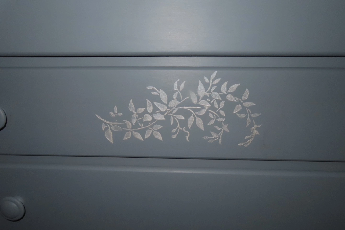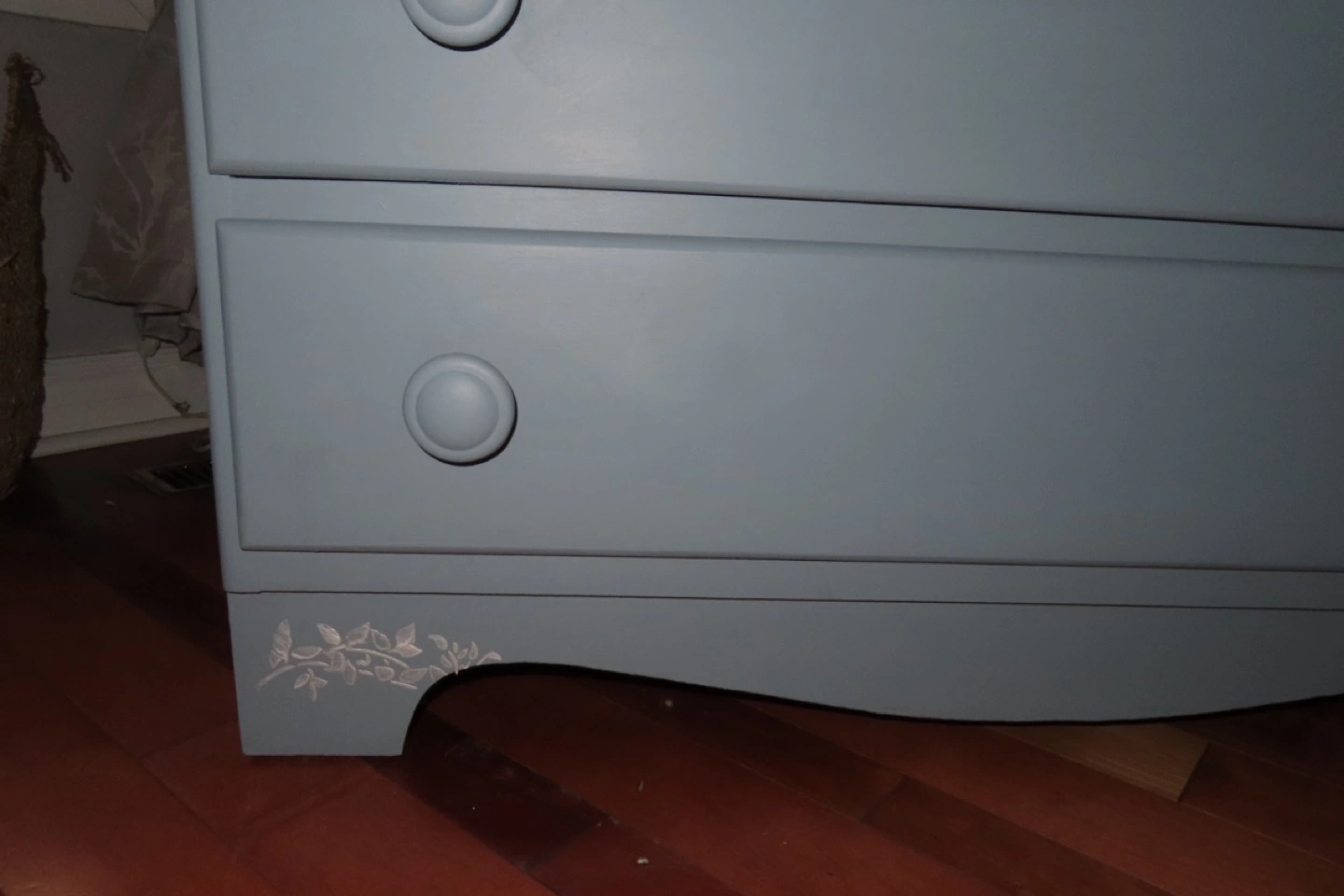 This stunning four-drawer pre loved dresser is a stylish statement piece for any room! It boasts a chic blue tone finish with a unique vine-like stencil design on the second drawer. Each drawer features elegant knobs for easy access. Though it has has a small chip on the top, it still maintains its charm and functionality.
