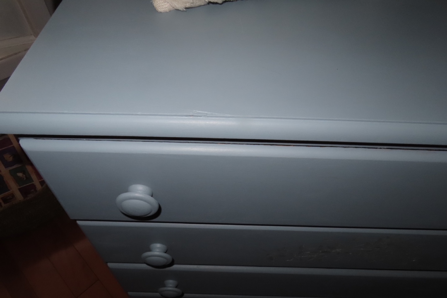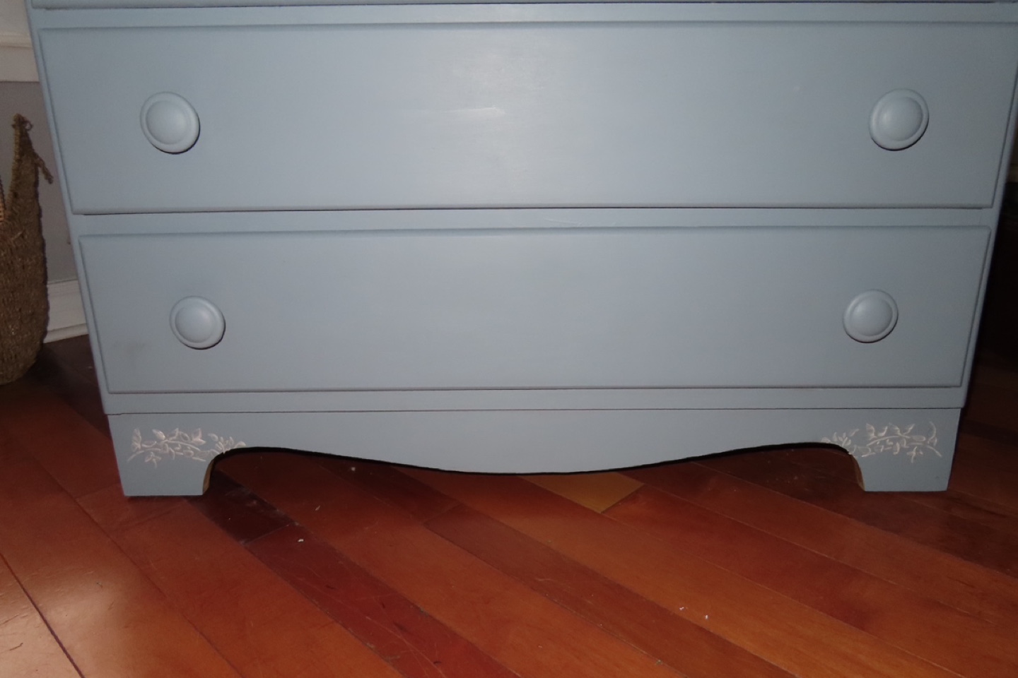 This stunning four-drawer pre loved dresser is a stylish statement piece for any room! It boasts a chic blue tone finish with a unique vine-like stencil design on the second drawer. Each drawer features elegant knobs for easy access. Though it has has a small chip on the top, it still maintains its charm and functionality.