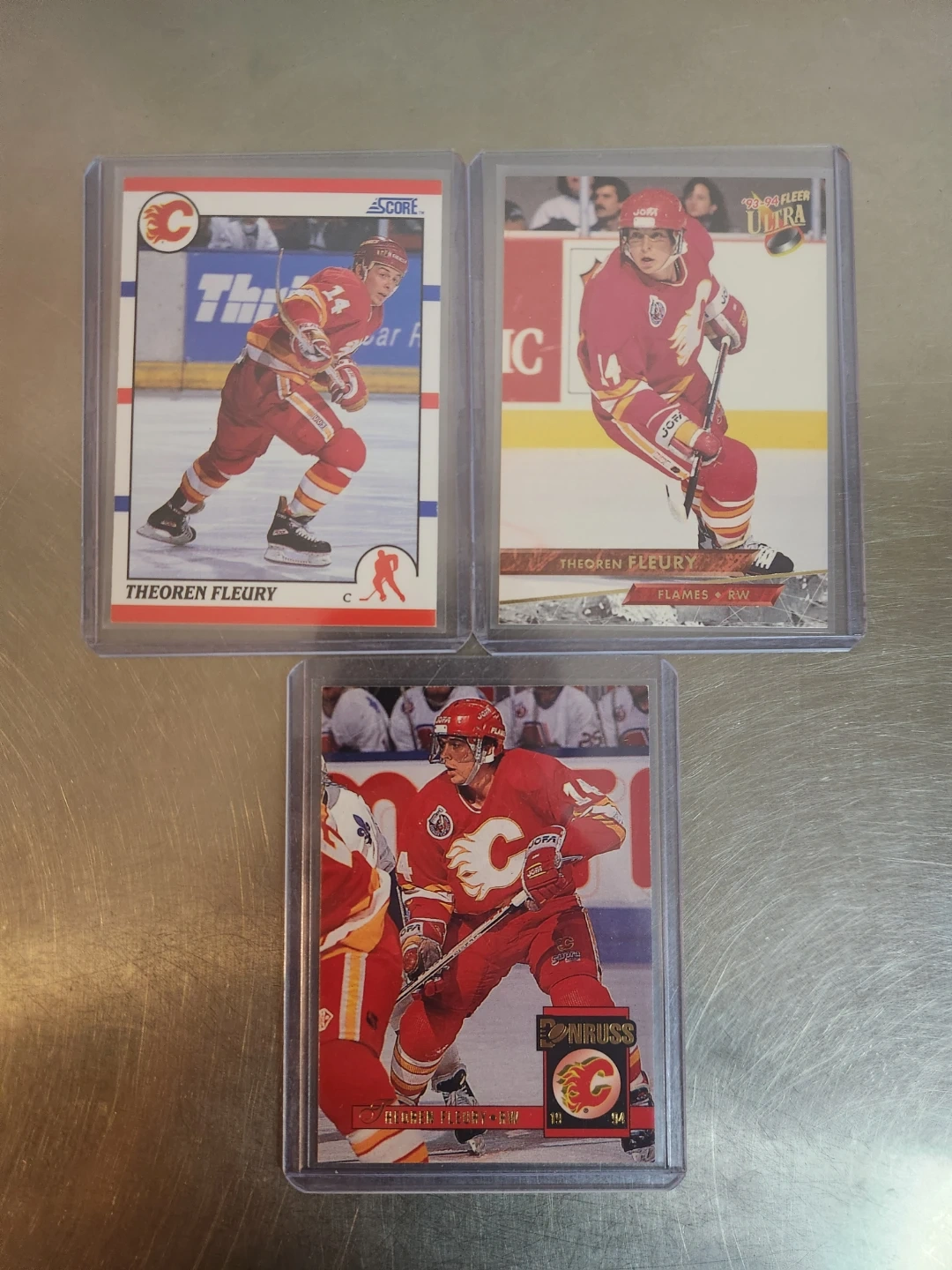 Collection of three Theoren Fleury hockey cards featuring him in his Calgary Flames uniform. Includes cards from Score, Donruss, and Fleer Ultra brands. Great for any Flames or hockey card collector!