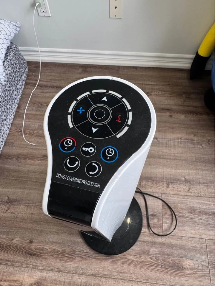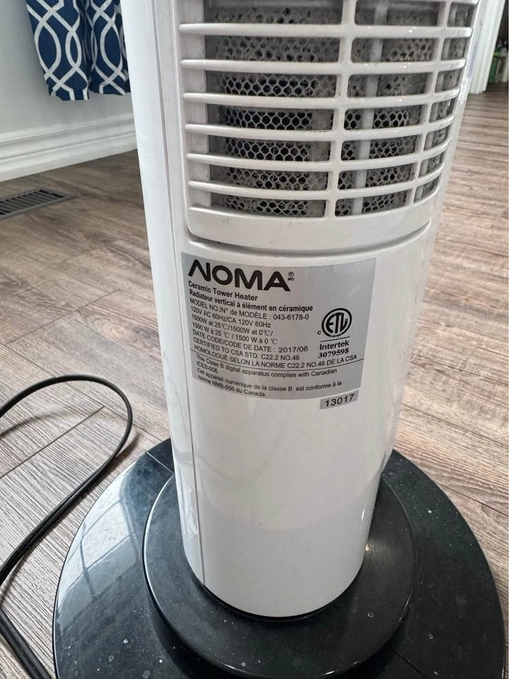NOMA 1500W Ceramic Tower Heater with Fan features a multi-function remote control for easy temperature adjustment from your couch or bed. Offers 3 heat settings (900/1500W) and an energy-saving auto setting. Ideal for small to medium sized rooms. Features a digital display, built-in timer, and wide-angle oscillation for even heat distribution. Power Cord Length: 6' (1.83 m). Power: 1500W/120V/60Hz. Size: 11" L x 11" W x 33" H (29 x 29 x 84.2 cm). Pick up in Courtice. Please check my other listings.