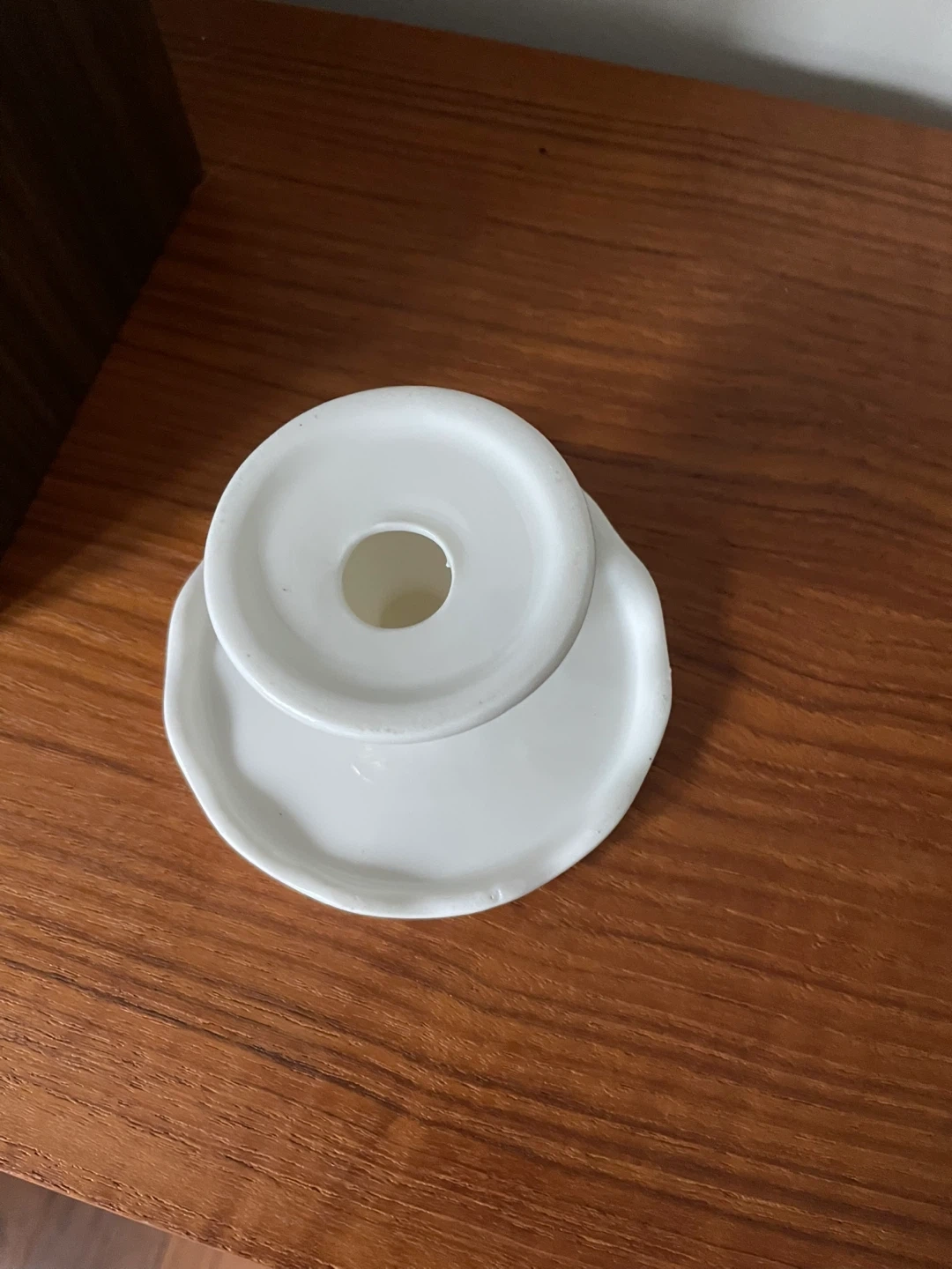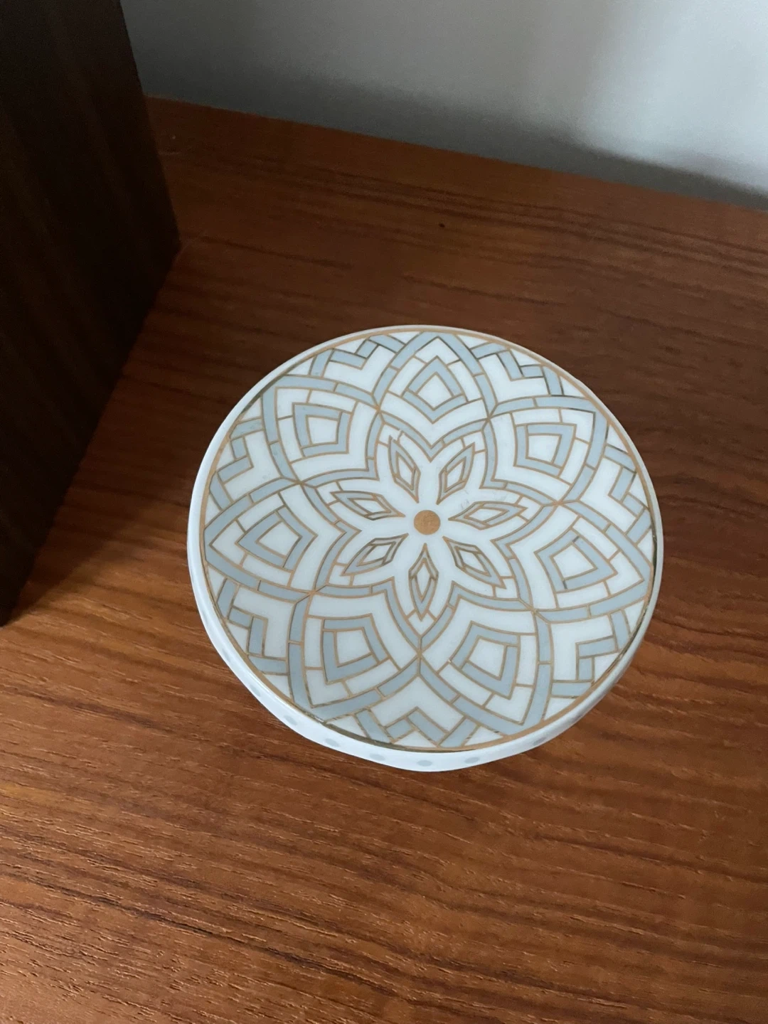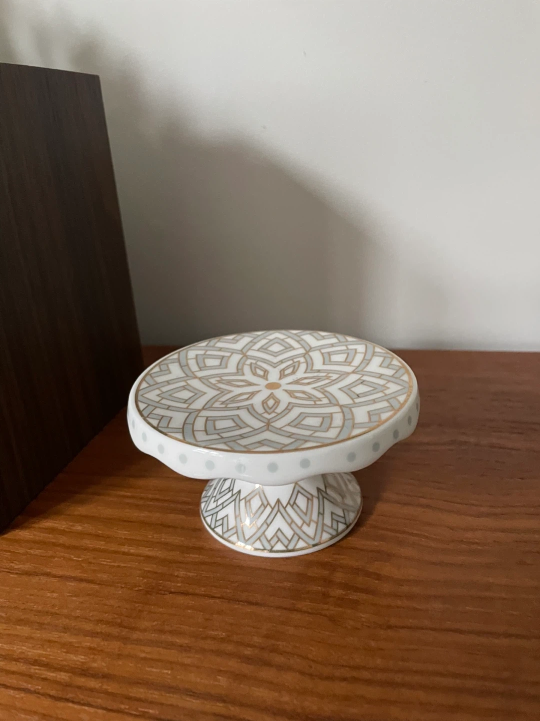 This ceramic cake stand has a decorative geometric pattern in gold and grey.