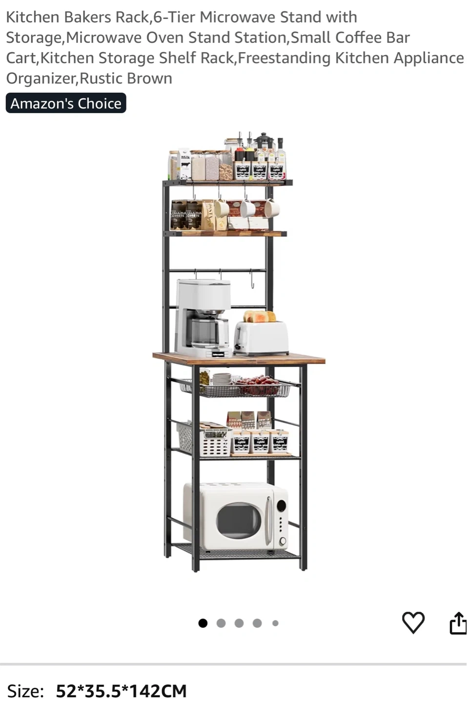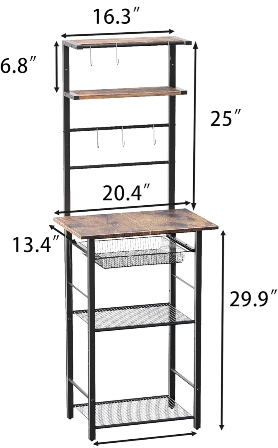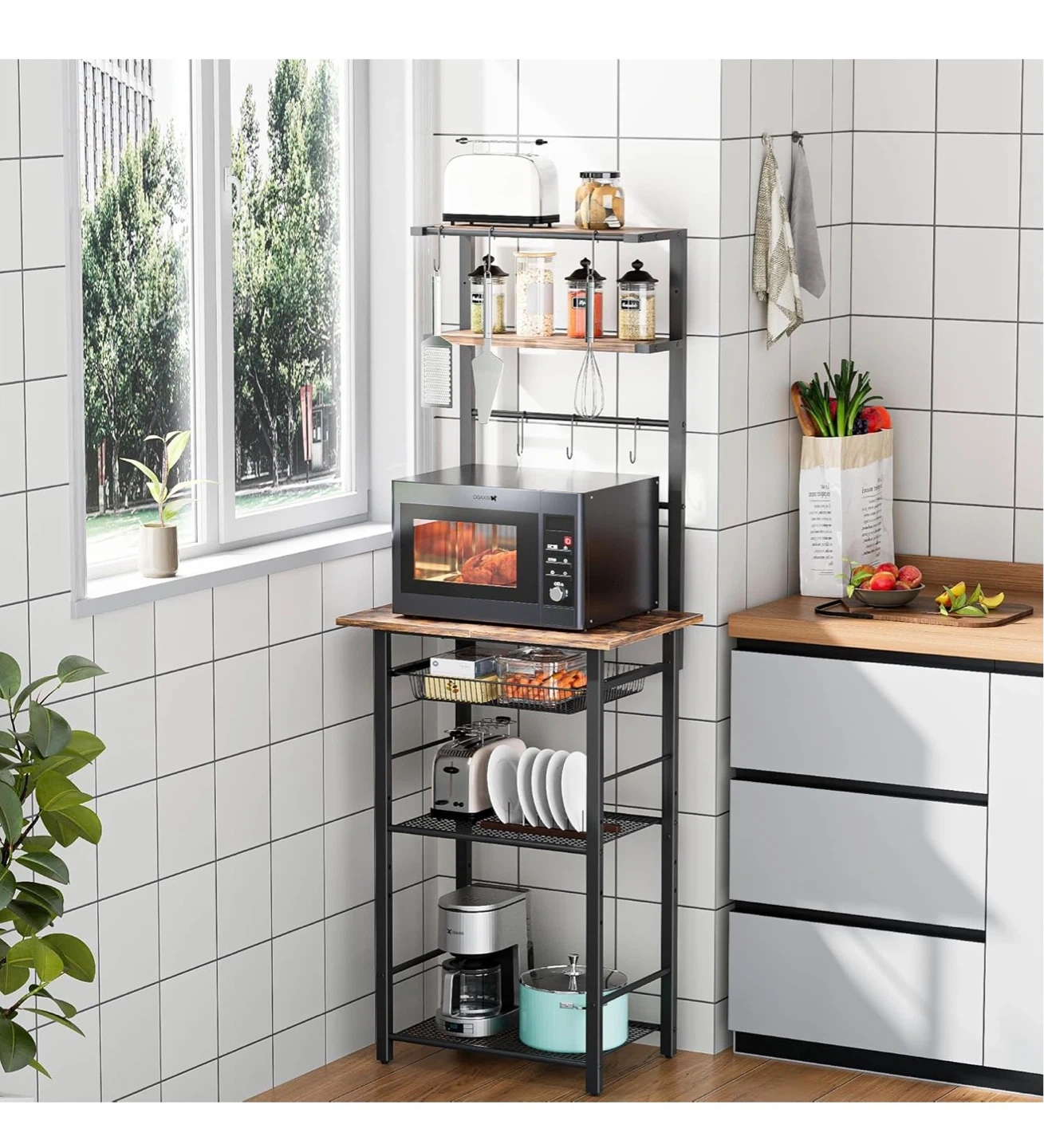 This 6-tier kitchen bakers rack offers ample storage for your appliances and kitchen essentials. It features a rustic brown finish and a sturdy metal frame. The dimensions are 52" x 35.5" x 142CM.