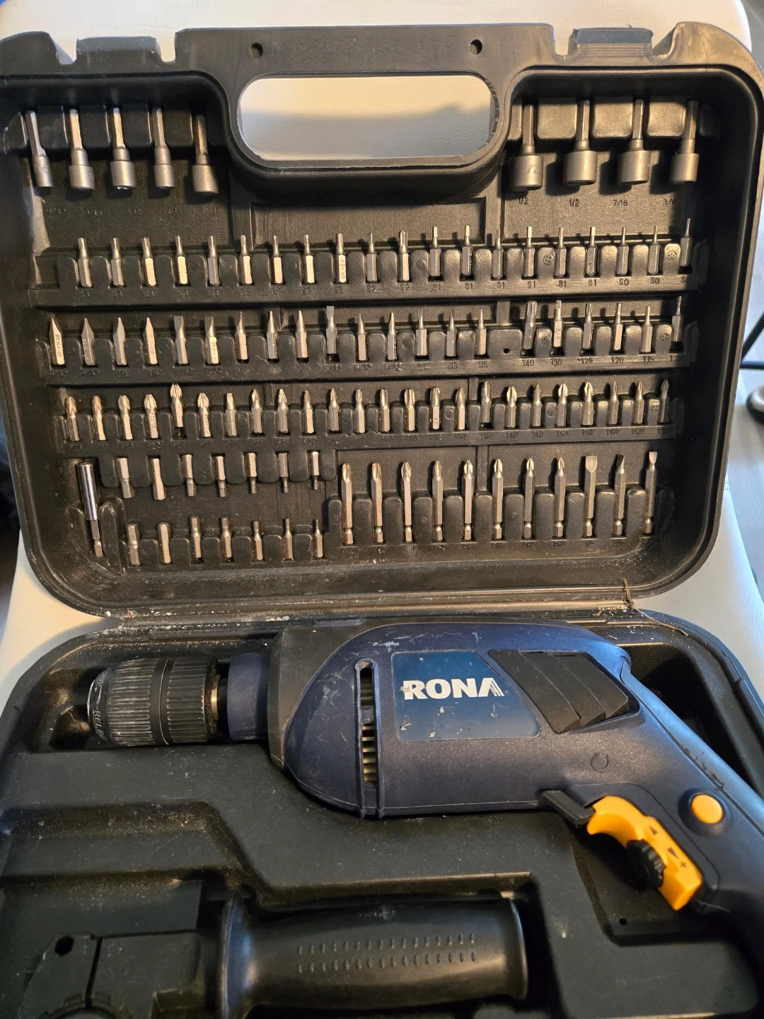 This RONA corded drill comes with a large assortment of bits in a convenient carrying case. It's a handy set for various home projects. The drill has a blue and yellow design.