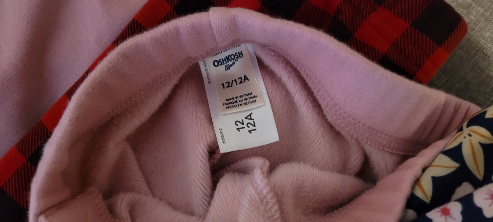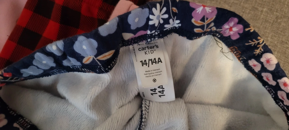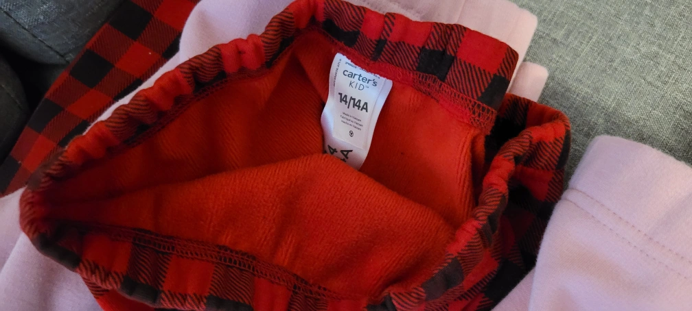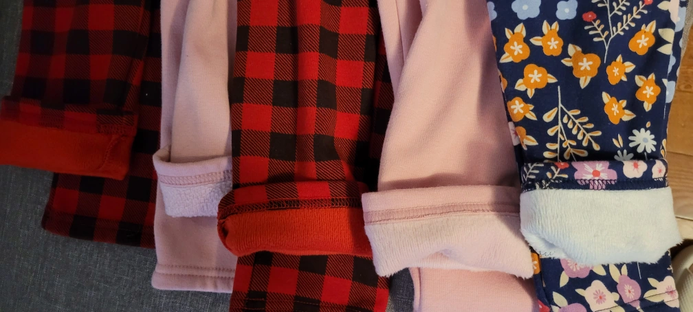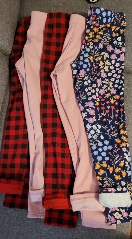 Bundle of four girls' fleece-lined leggings. Includes two pink leggings, two red and black plaid leggings, and one patterned leggings. Sizes 12/14,(Size down a little) Great for colder weather.