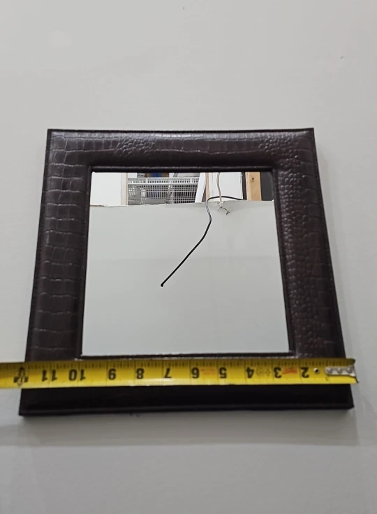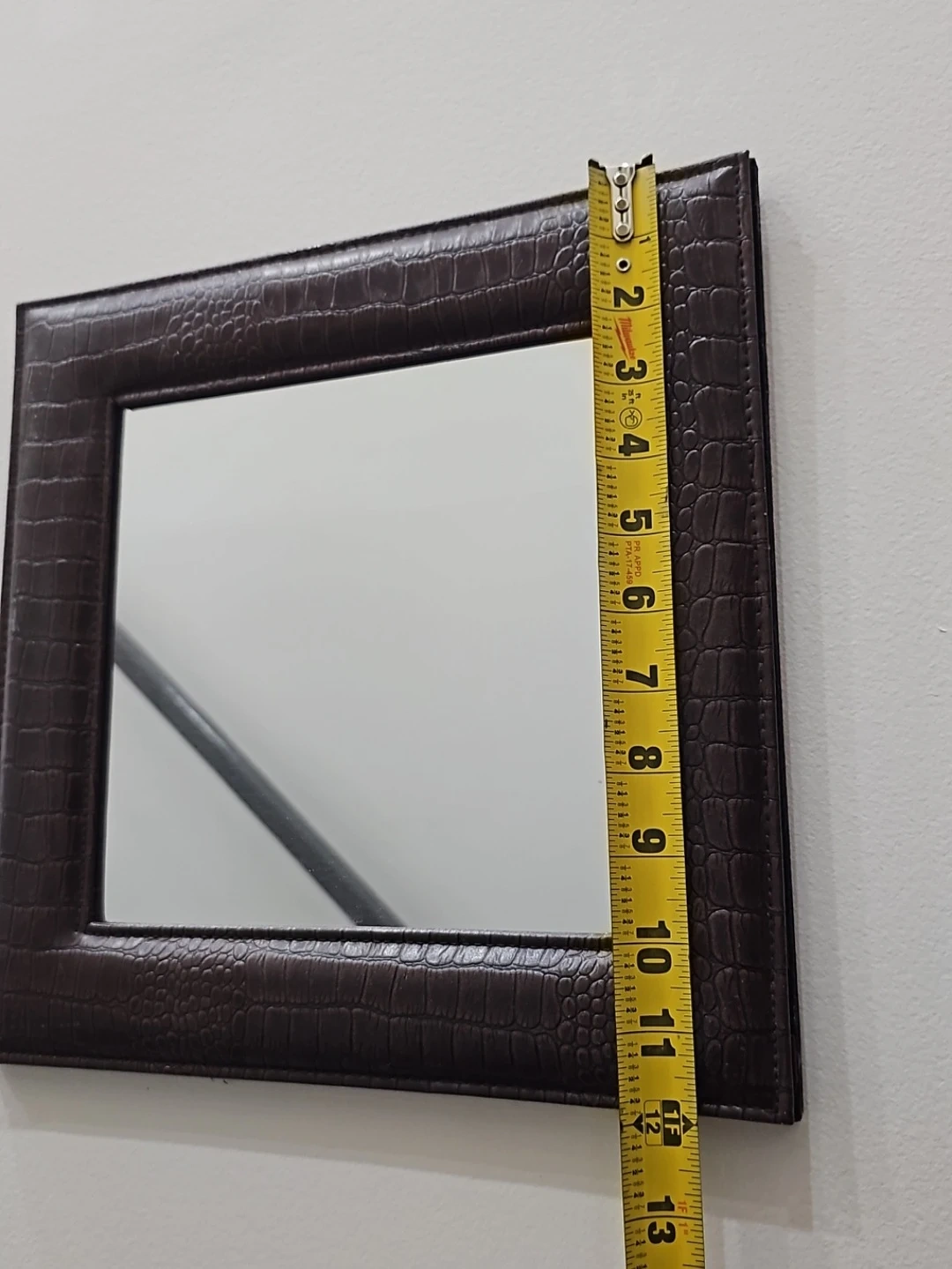 Here's a stylish mirror with a unique brown crocodile print frame! It measures approximately 12 inches in length and 12 inches in height. This mirror would make a great addition to any room!