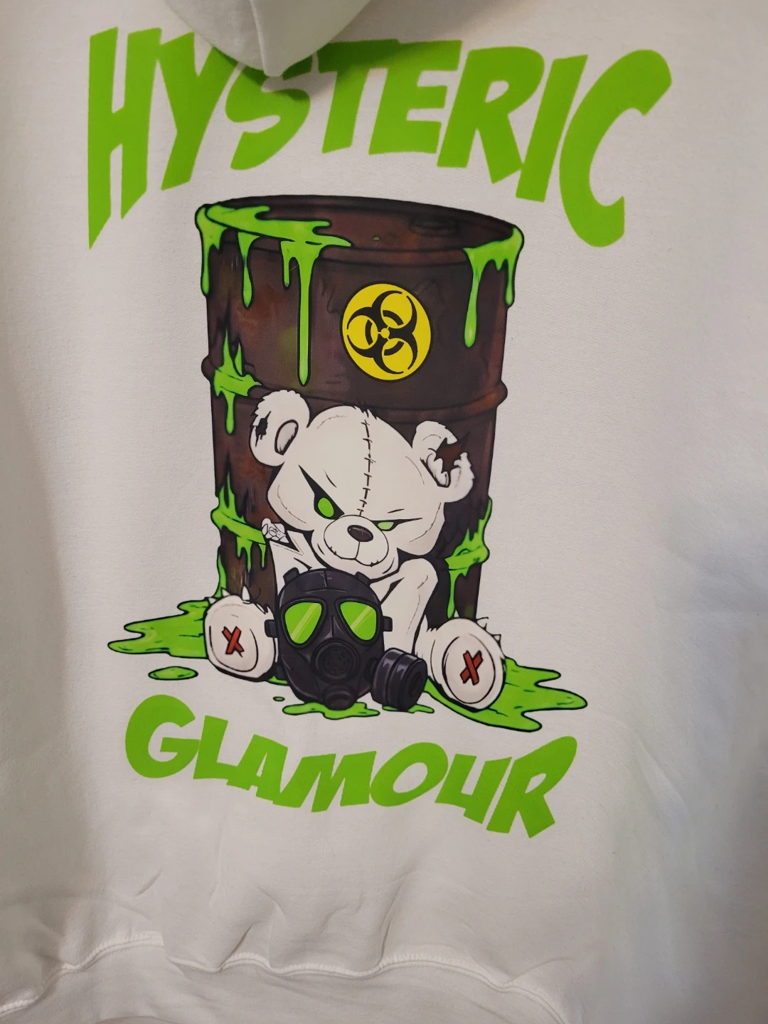 This Hysteric Glamour x TOXICKIND hoodie features a graphic print of Toxic Teddy with a gas mask on the back and a biohazard barrel design on the front . It's made of a comfortable cotton blend. This pullover style comes with a front pouch pocket and an adjustable drawstring hood.