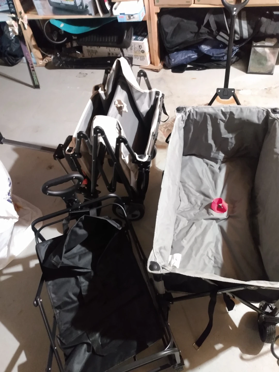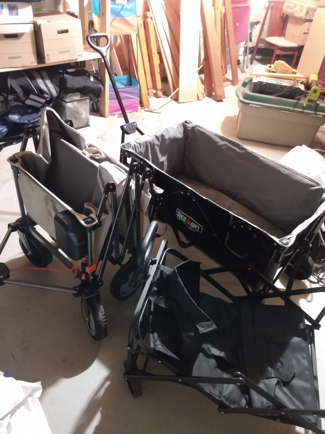 Three Overmont folding utility wagons. One is beige and grey, the other is black. They're great for hauling gear to events or around the campsite.