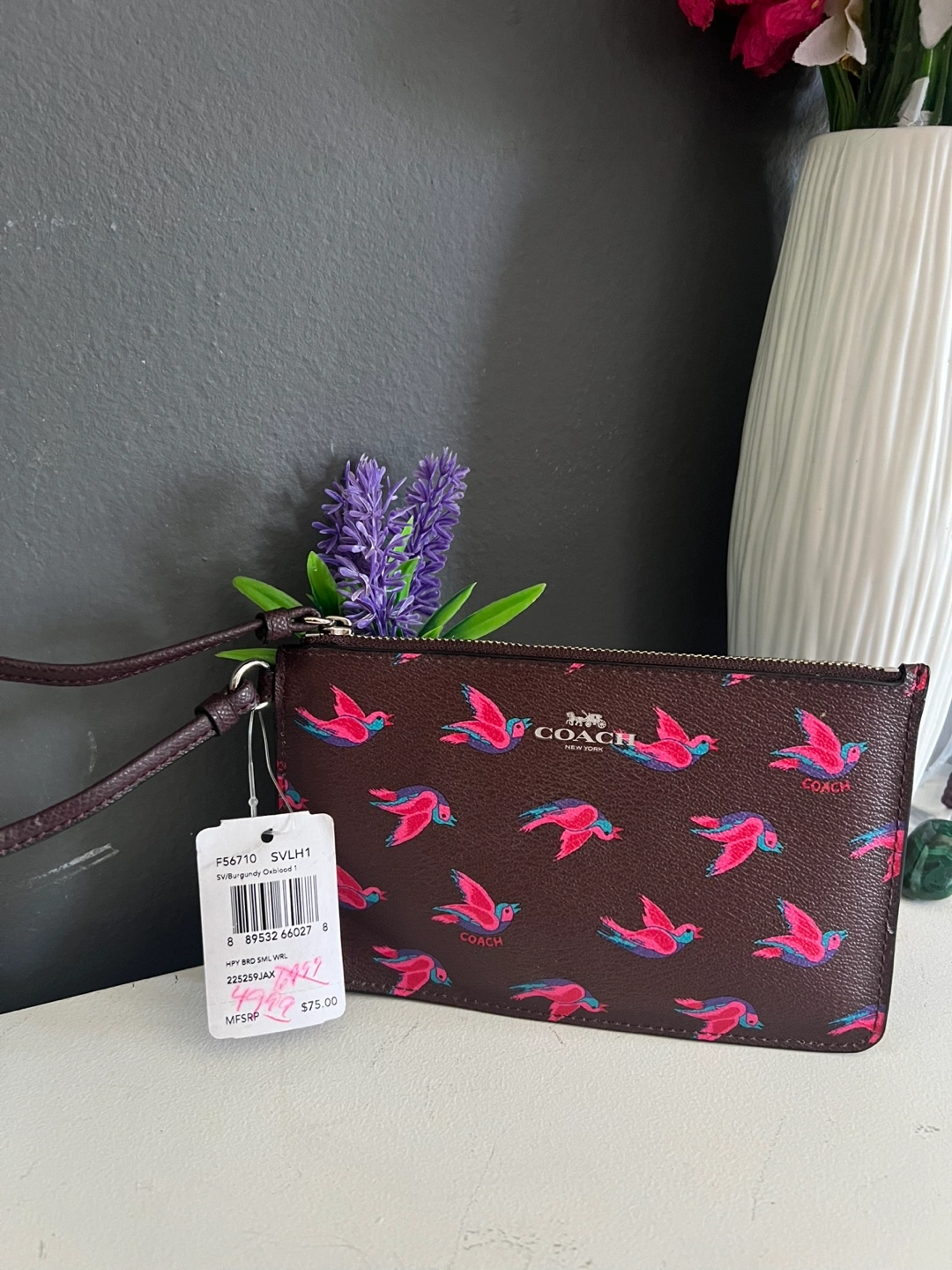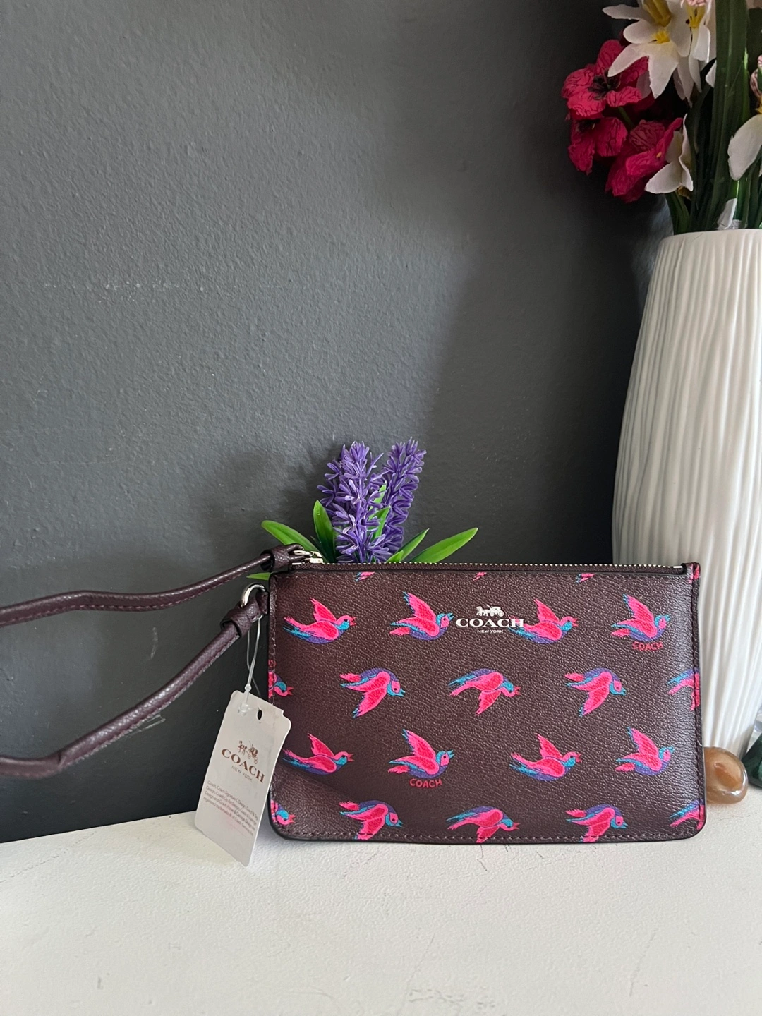 This Coach wristlet features a fun brown background with a repeating bird print. It's perfect for carrying essentials on the go. The bag includes a detachable wrist strap.
