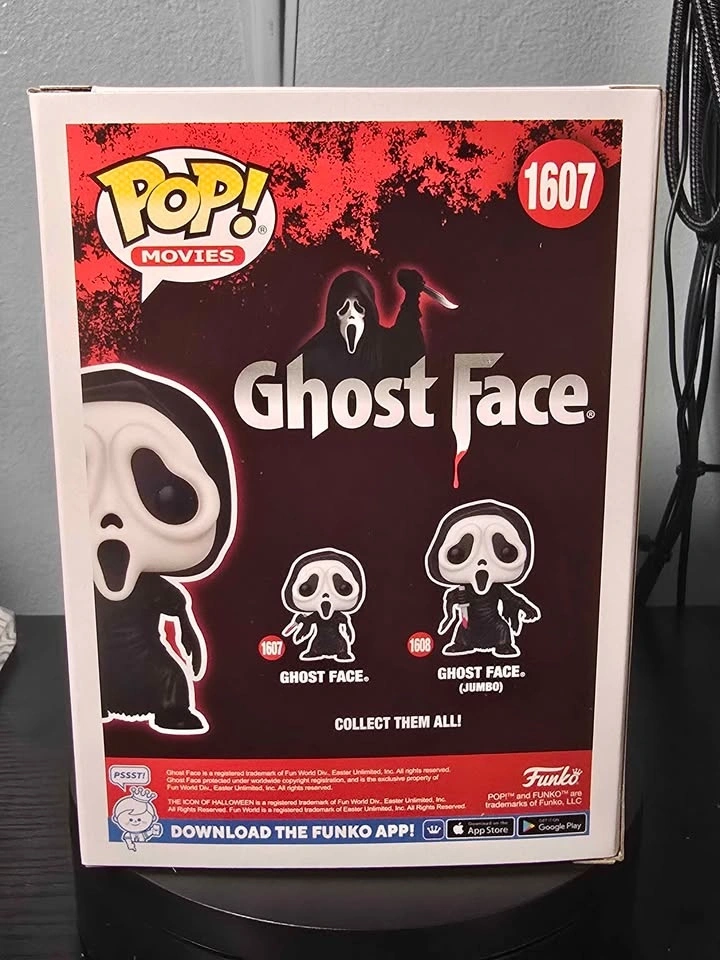 This is a Funko Pop! Movies vinyl figure of Ghost Face, number 1607. The figure comes in its original box. It's a collectible item for fans of the horror franchise. Pick-up only. Serious inquiries only. Cash only.