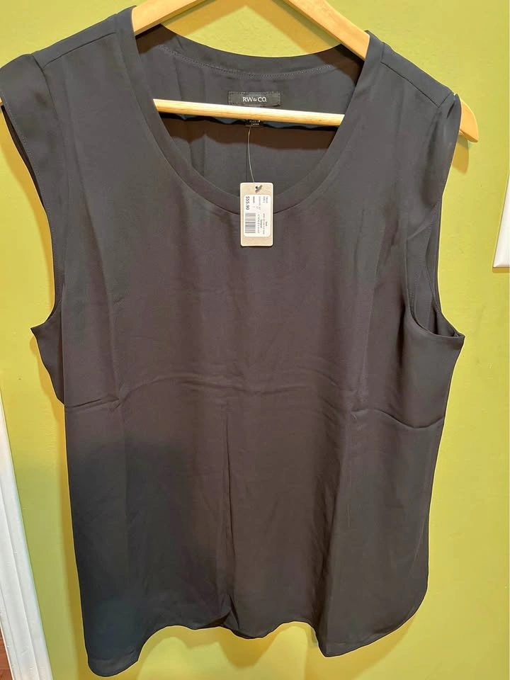 Stylish black sleeveless top from RW&CO. Has a scoop neck and a relaxed fit. Size L, new with tags still on. Super comfy material, great for dressing up or down.