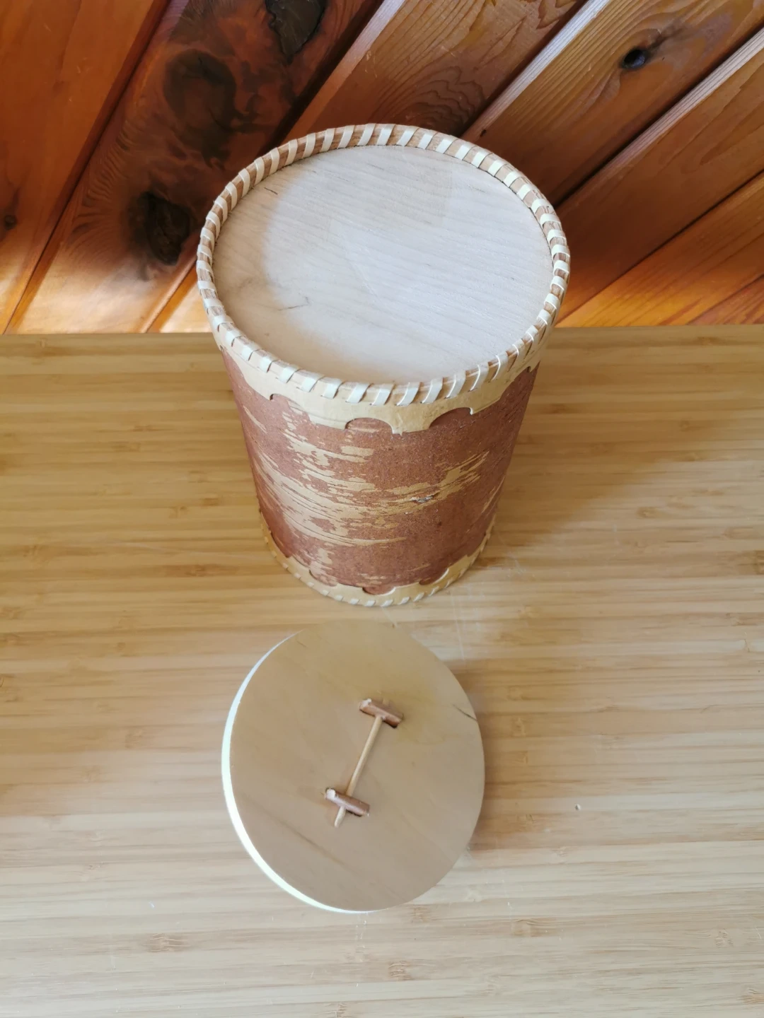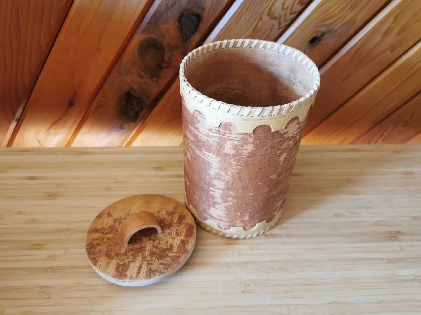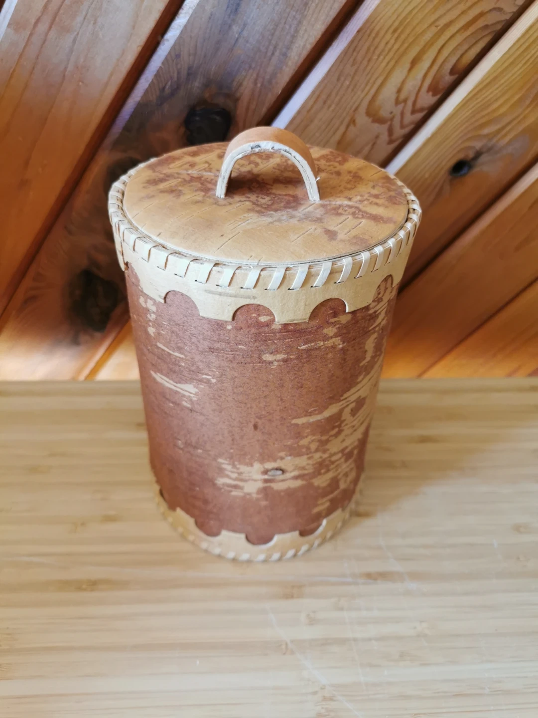 Made of genuine birch bark with natural reddish-brown surface, hand-laced rim and base. Sturdy and well-built, with traditional bentwood lid handle that fits perfectly