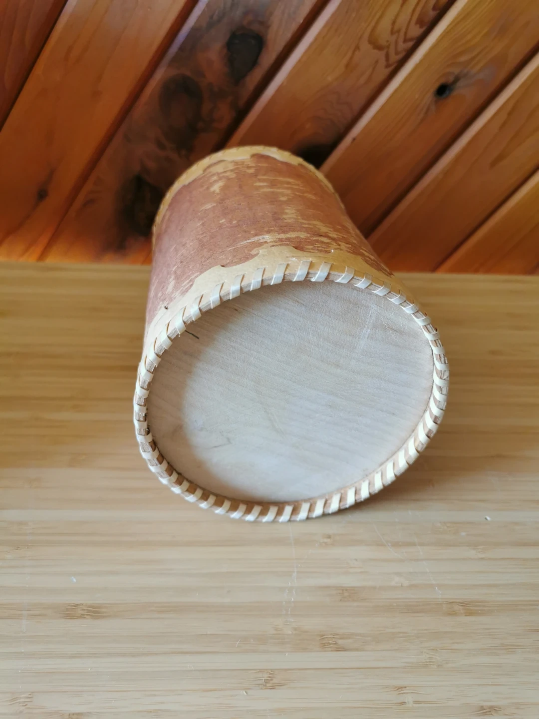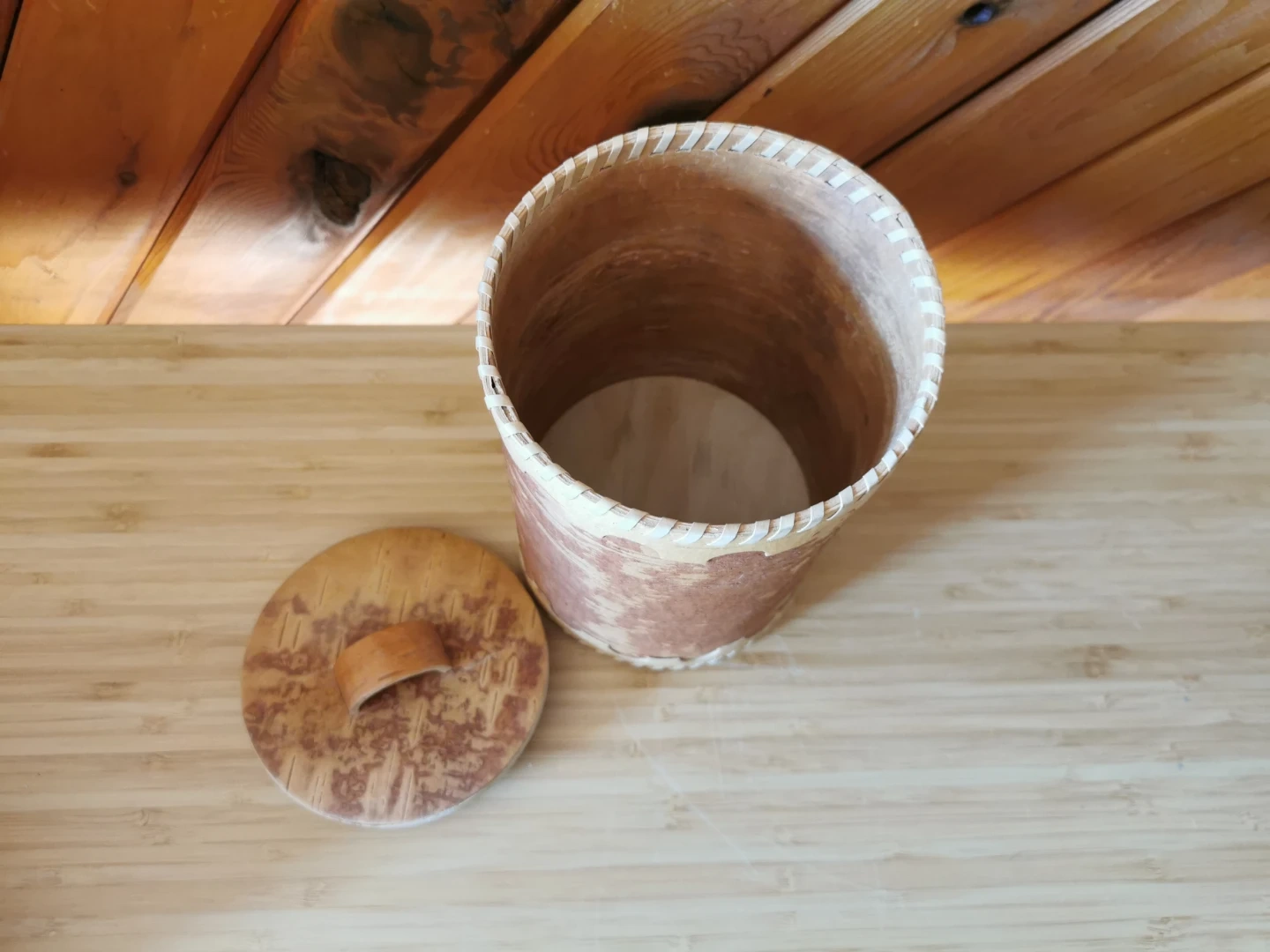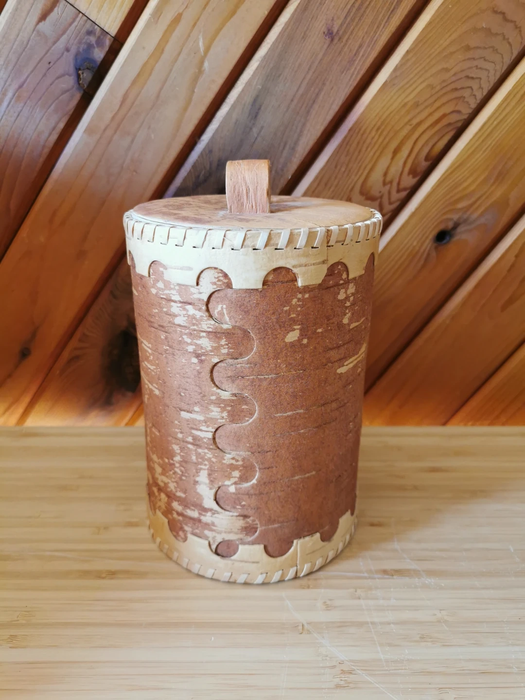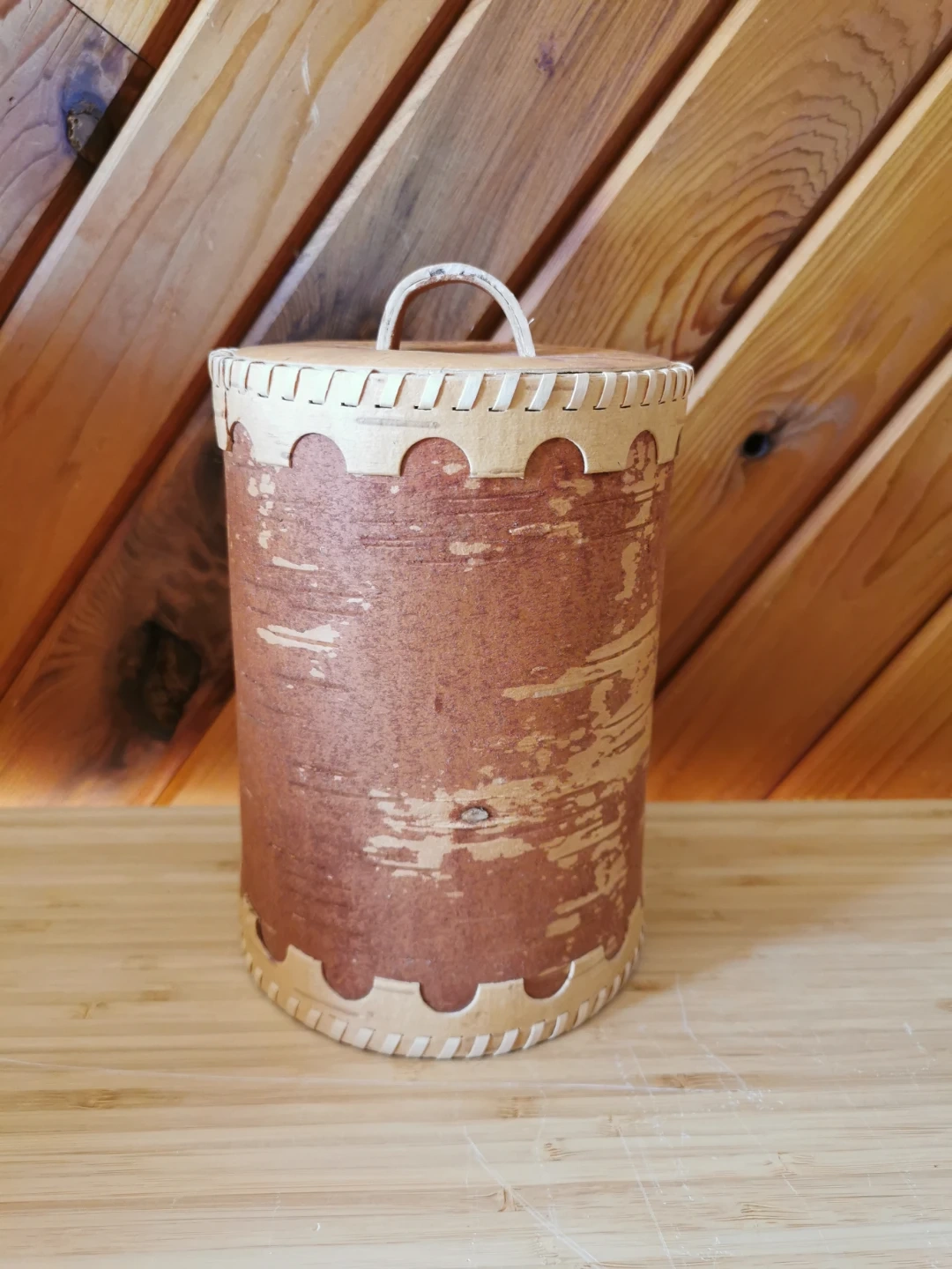 Made of genuine birch bark with natural reddish-brown surface, hand-laced rim and base. Sturdy and well-built, with traditional bentwood lid handle that fits perfectly