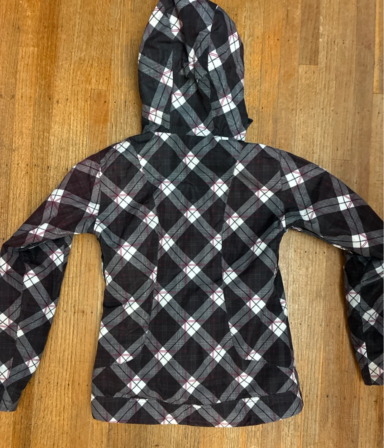 Burton hooded ski jacket in a plaid pattern. Size Ladies XS. It's designed with a full zip and zippered pockets. This jacket offers a stylish and functional outerwear option.