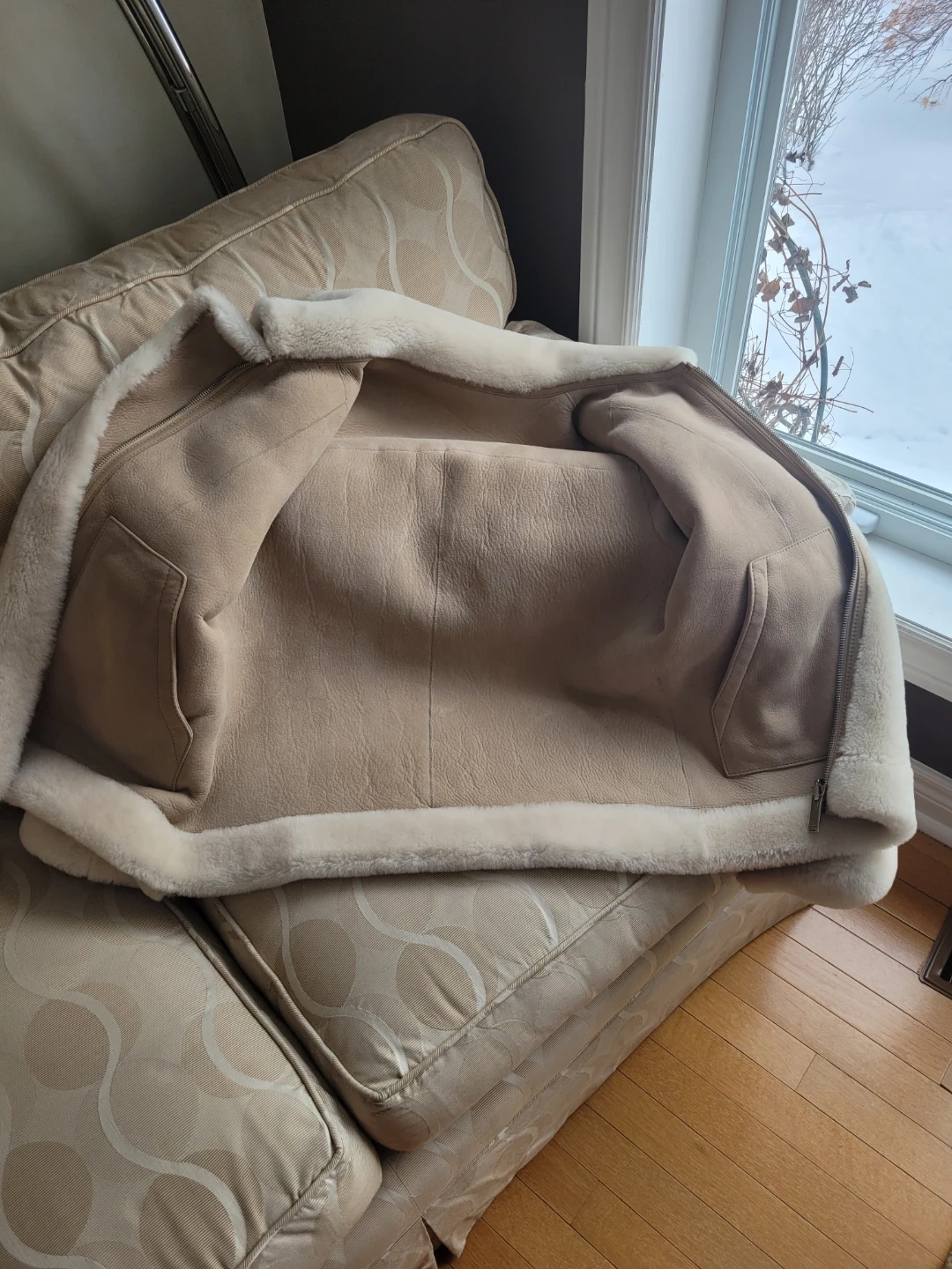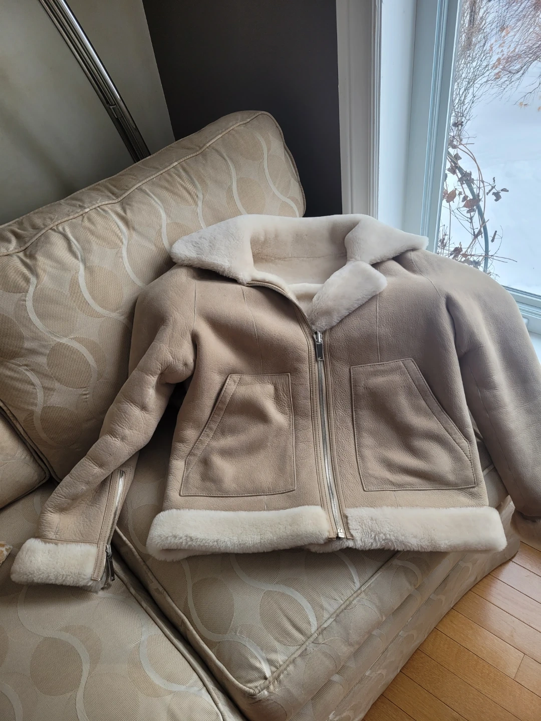 This jacket by Massimo Dutti features a classic neutral suede exterior with a cozy white shearling lining. "REVERSIBLE" aviator style, zip-up front and patch front pockets worn both ways. It's a stylish choice for cooler weather!