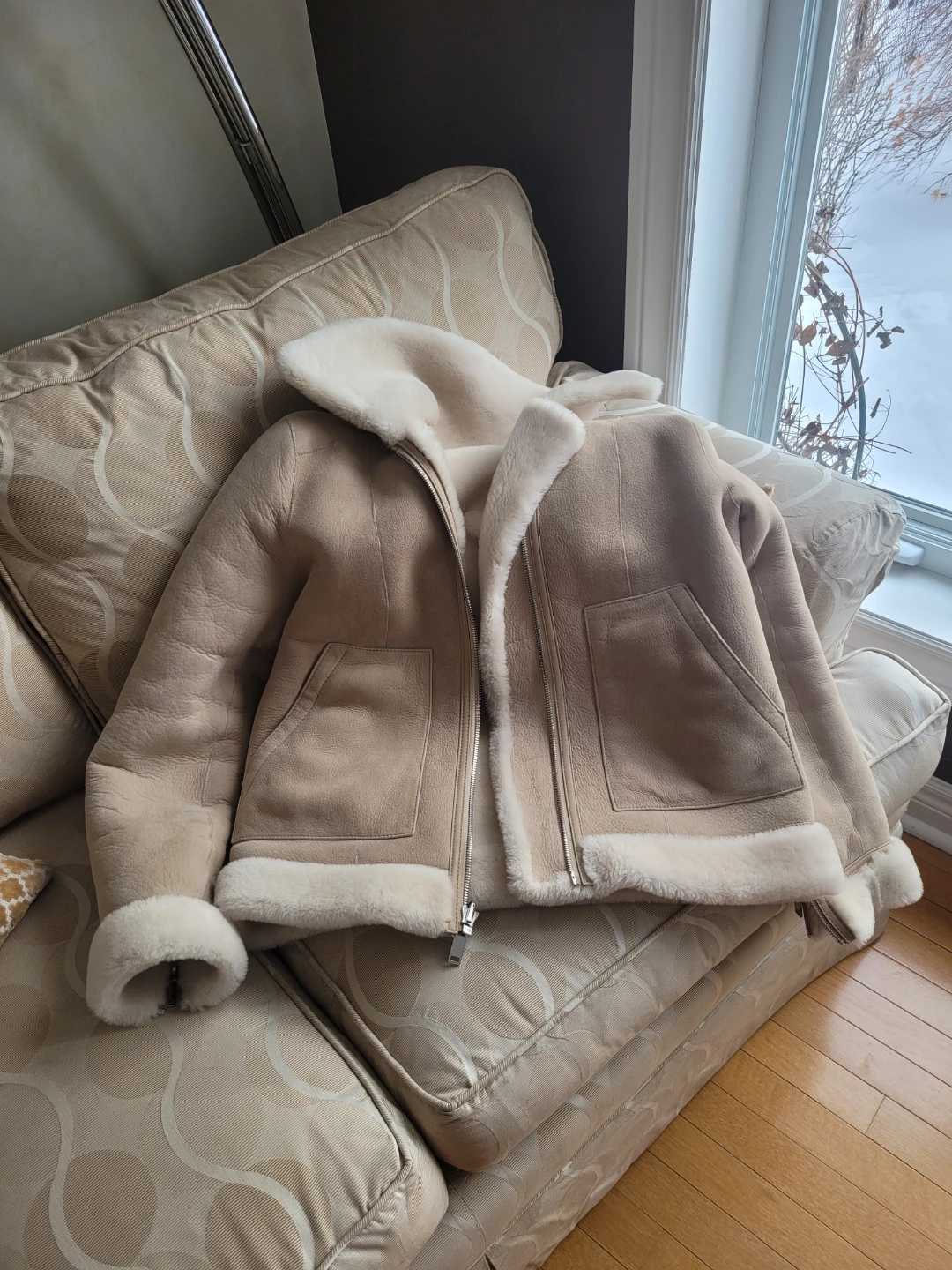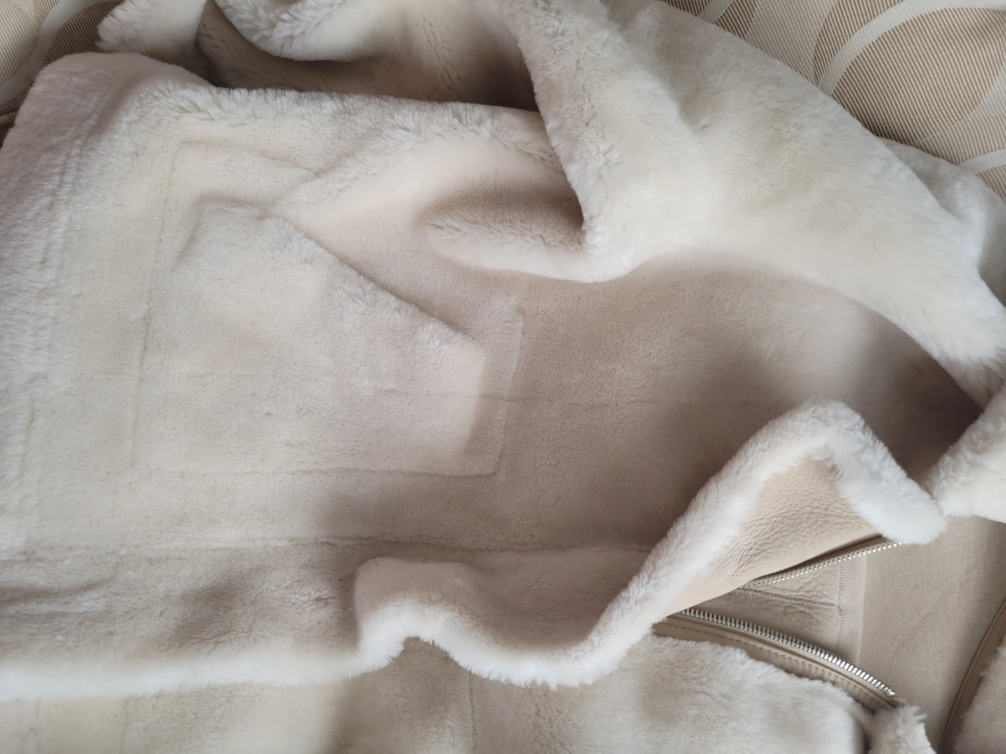 This jacket by Massimo Dutti features a classic neutral suede exterior with a cozy white shearling lining. "REVERSIBLE" aviator style, zip-up front and patch front pockets worn both ways. It's a stylish choice for cooler weather!