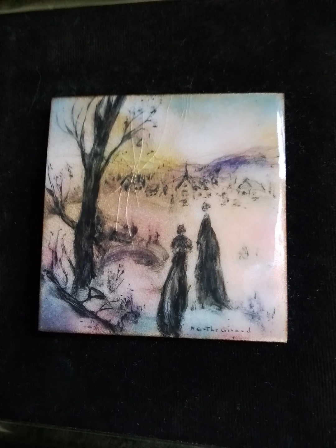 This is a scenic enameled painting on copper, signed by Marthe Girard, with dimensions of 6.5x6.5 inches. This vintage piece showcases a beautiful winter landscape with figures, capturing a serene and timeless scene. Note this is a used piece and has some cracking in the enamel.