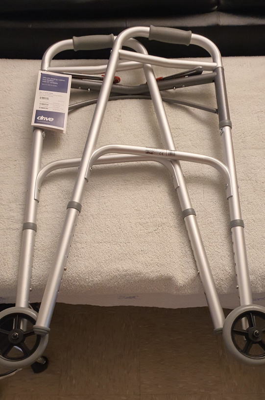 This is a Drive Medical folding walker. It's silver and has two wheels at the front. It's designed to assist with mobility. It folds for easy storage and transport.
