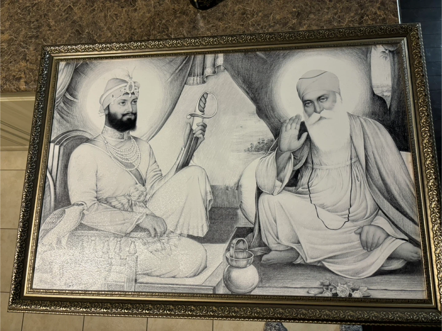 This framed print depicts Guru Gobind Singh Ji and Guru Nanak Ji. It's a detailed black and white illustration, perfect for display. The frame is ornate and complements the artwork beautifully.