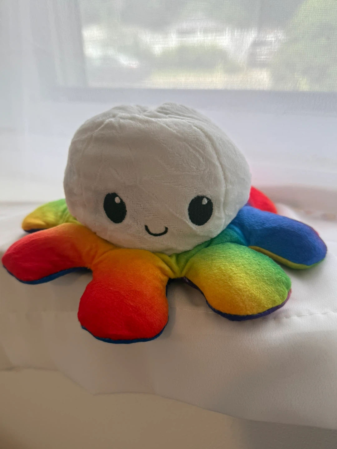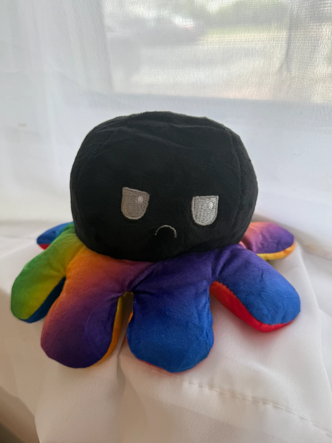This plush toy is reversible, showing two different expressions. It's made of soft material with rainbow-colored tentacles. A fun toy for expressing moods!