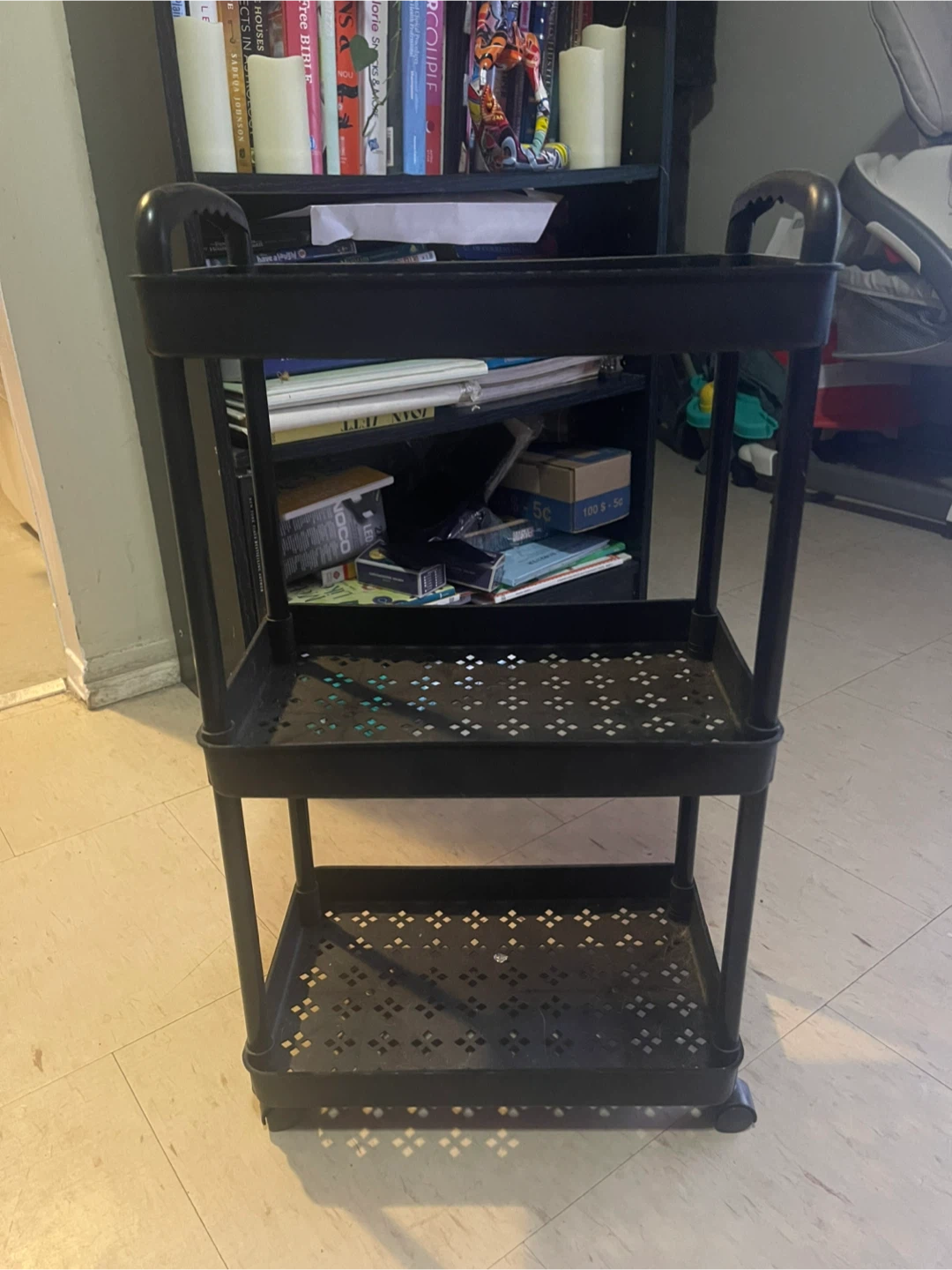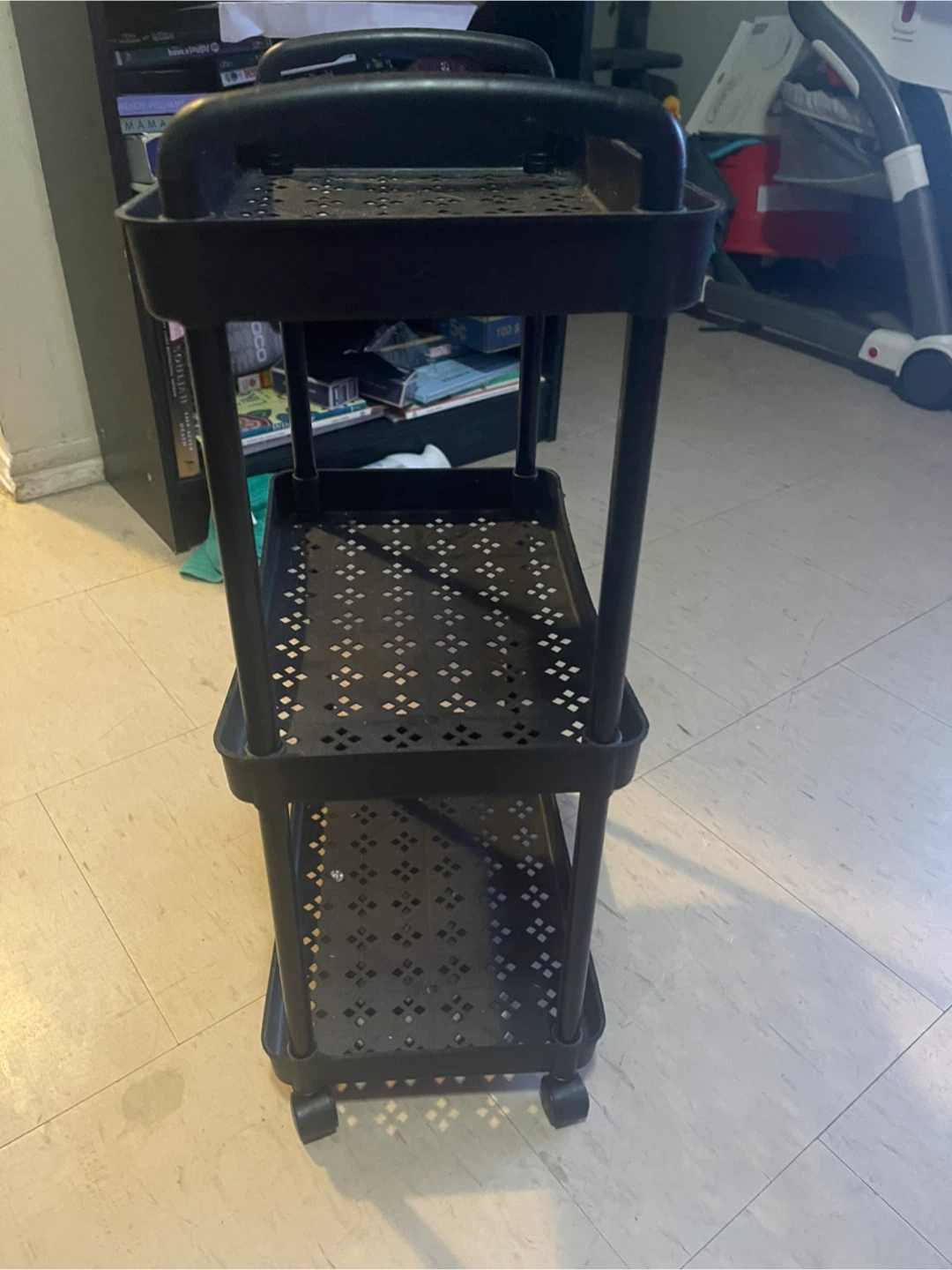 This black 3-tier rolling storage cart offers versatile organization. It's made of durable plastic and features perforated shelves with a decorative pattern. The cart has wheel. It’s approximately 2 ft tall
