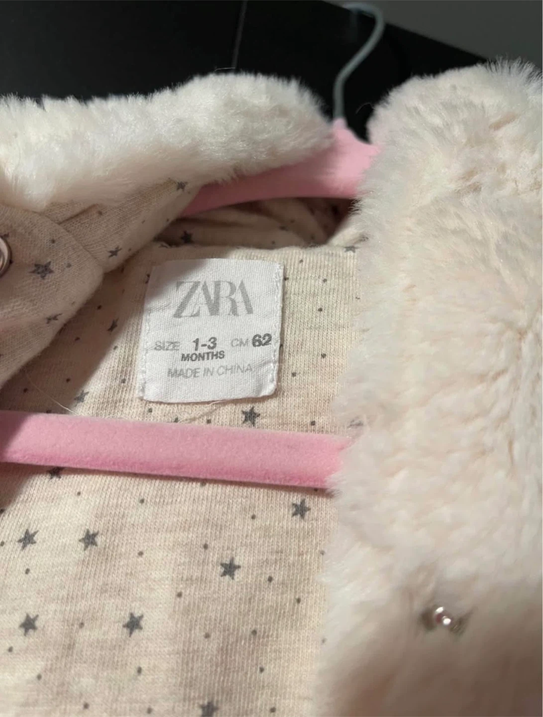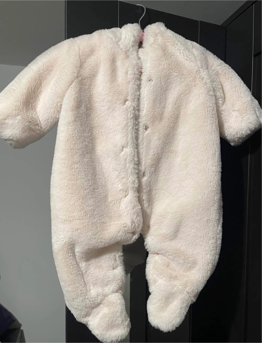 Super soft and cozy cream-coloured plush bunting snowsuit from Zara. Features a full button-up front and footies. Size 1-3 months, which is also CM 62.