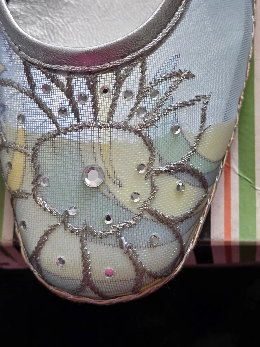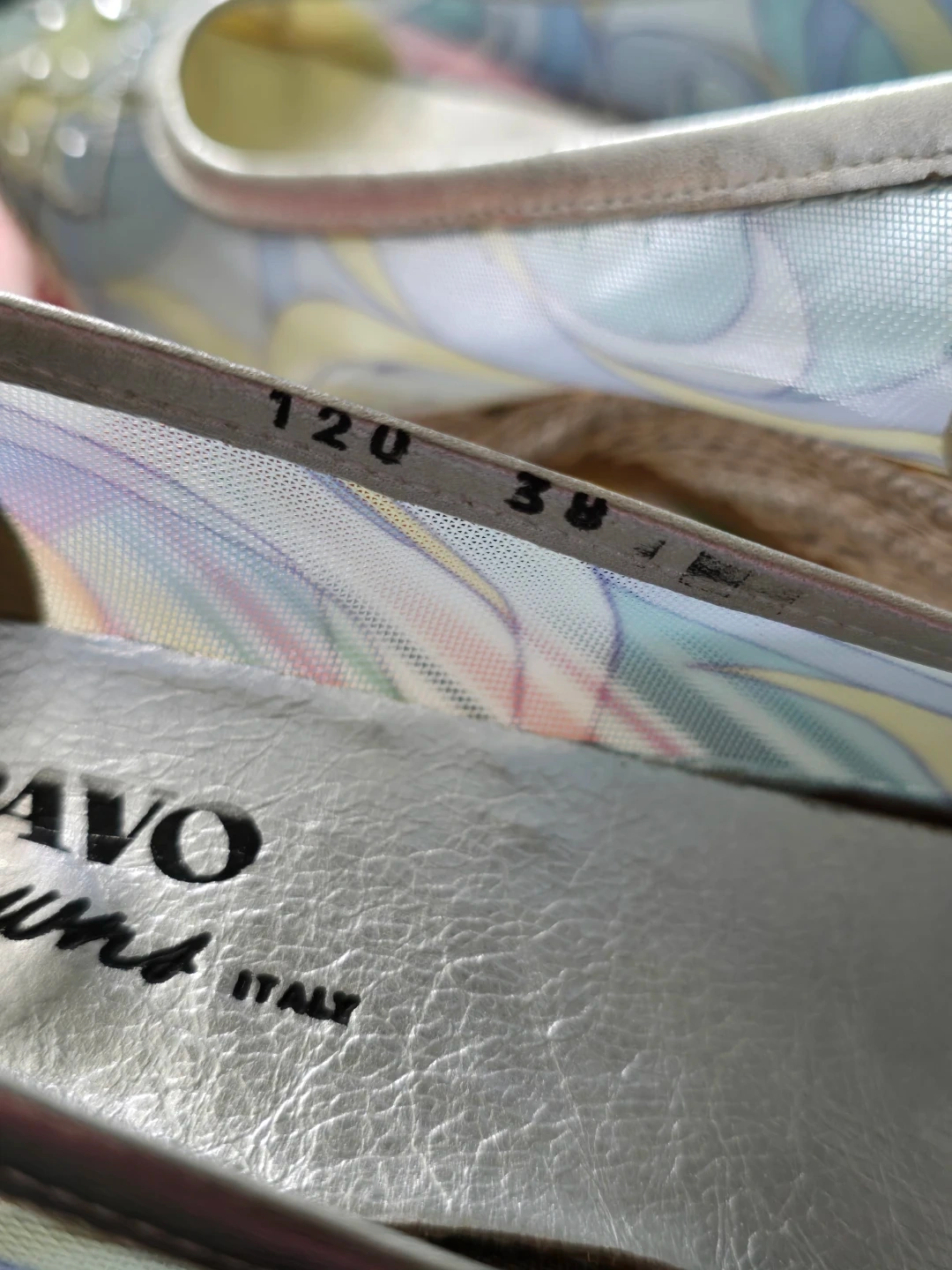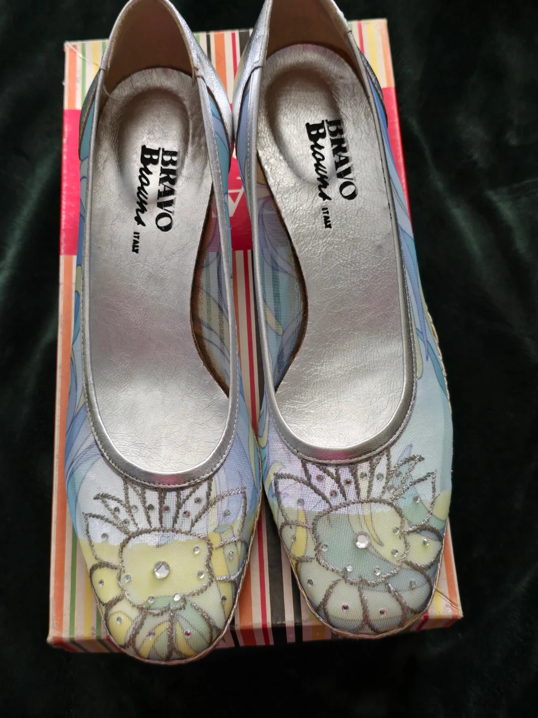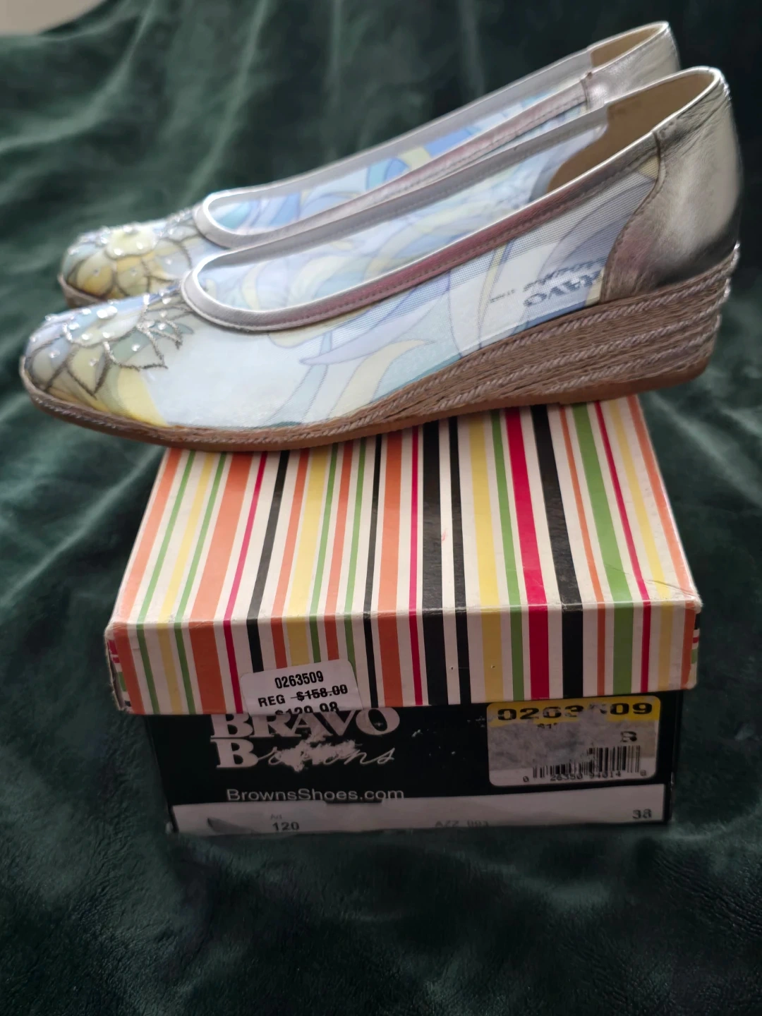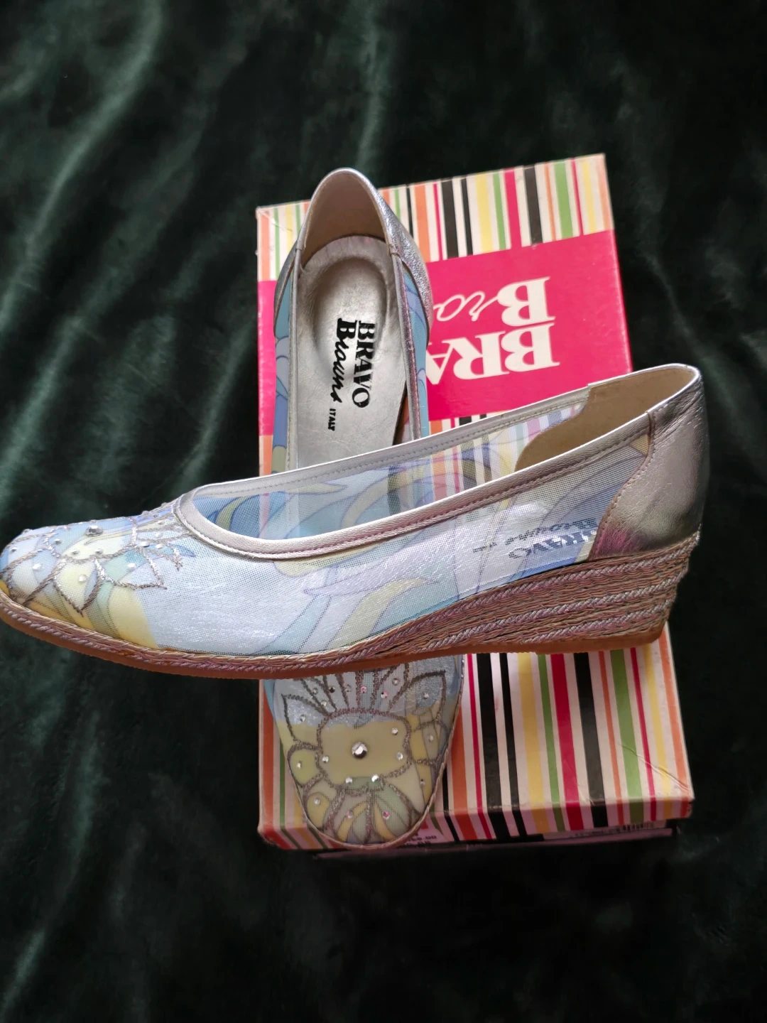 These Bravo Browns wedge espadrille flats feature a colourful floral print with sparkling embellishments. The shoes are made in Italy and include the original box. They're a stylish choice for adding a pop of colour to any outfit!