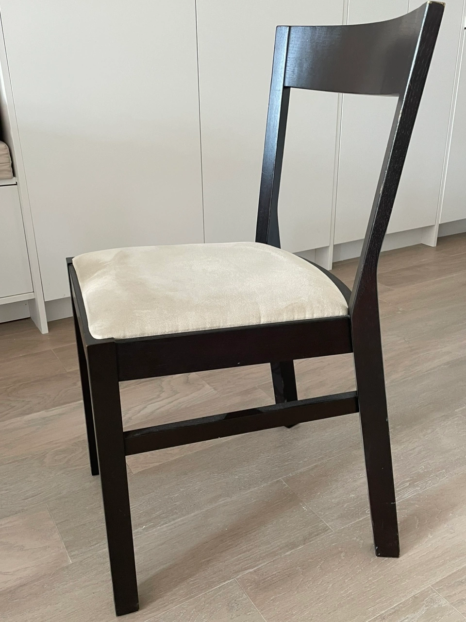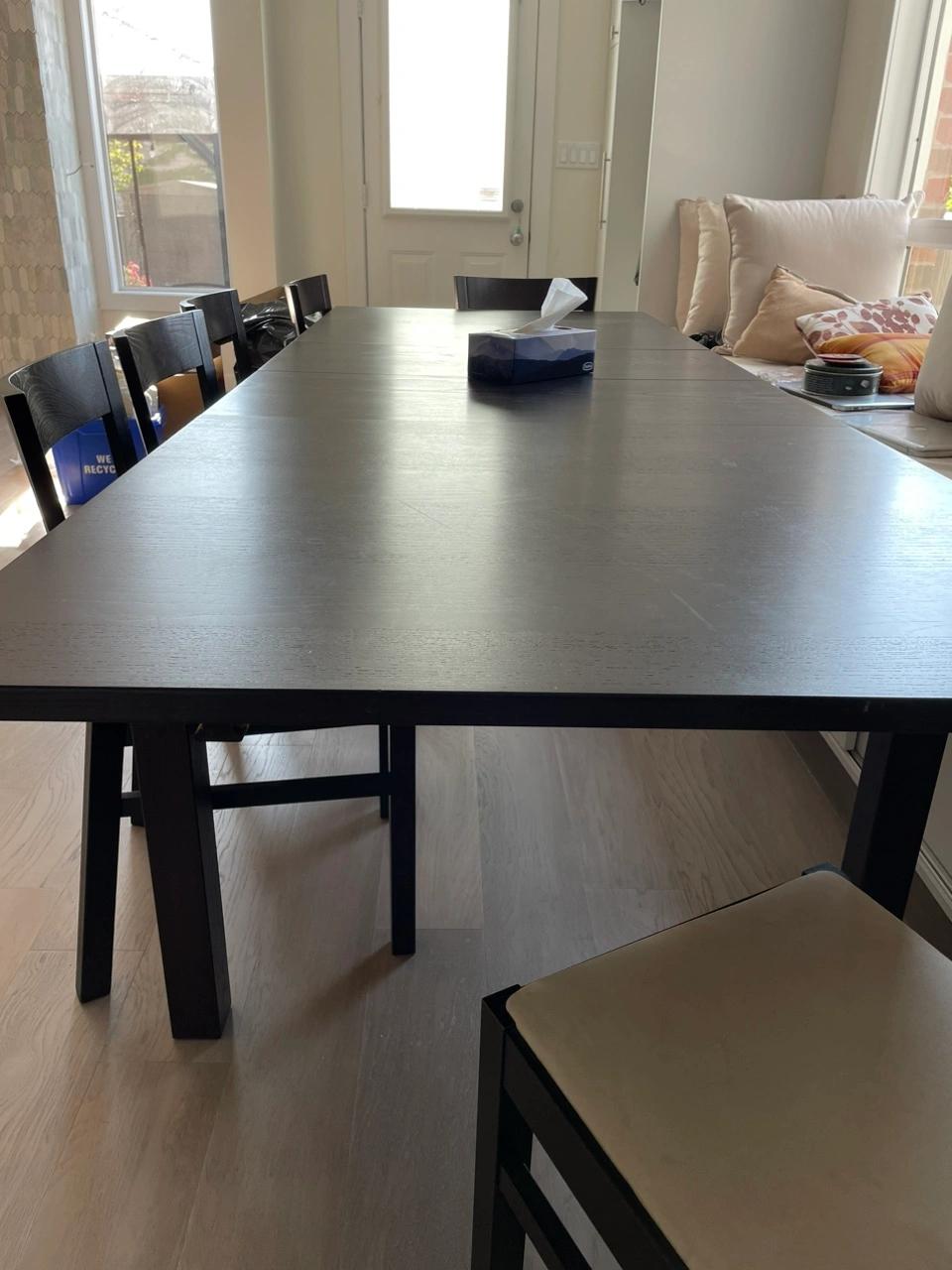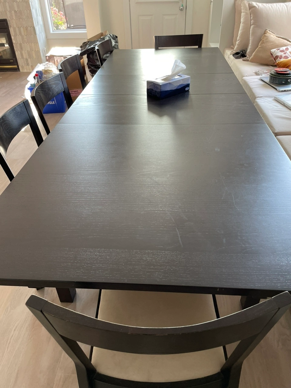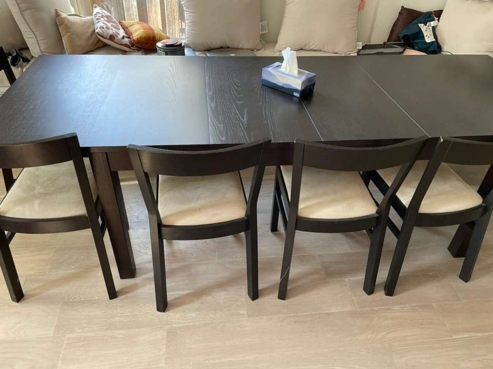 This is a seven-piece dining set with a table and six chairs. The table is extendable with 2 leaves at 16 3/4” wide each. The chairs have beige cushions.