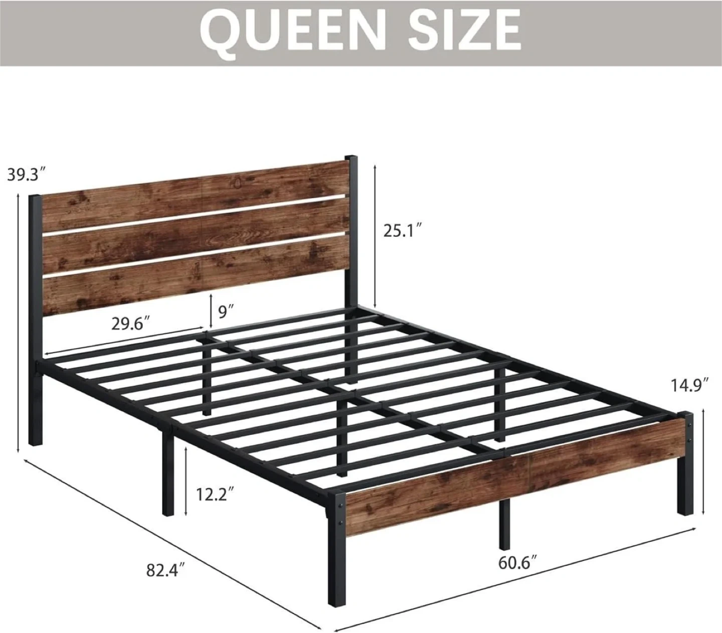 Queen size bed frame with a rustic wood headboard and metal frame. Slatted design provides mattress support. Easy assembly required.