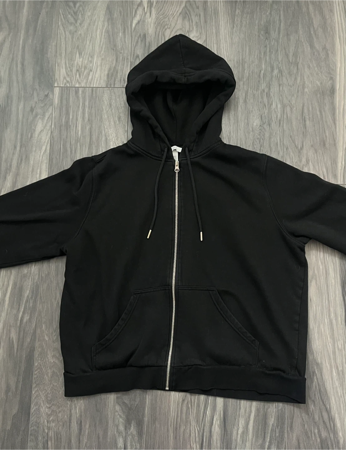 Black zip-up hoodie. Good basic staple piece. Cotton blend material. Soft and comfortable. Can be worn oversized.