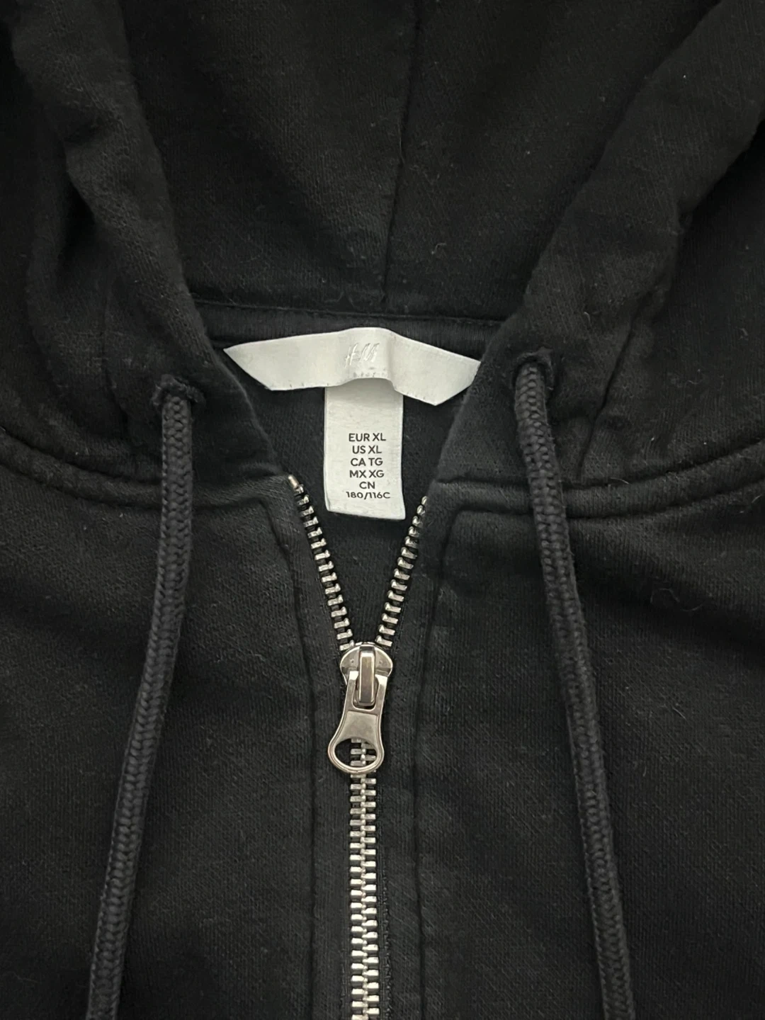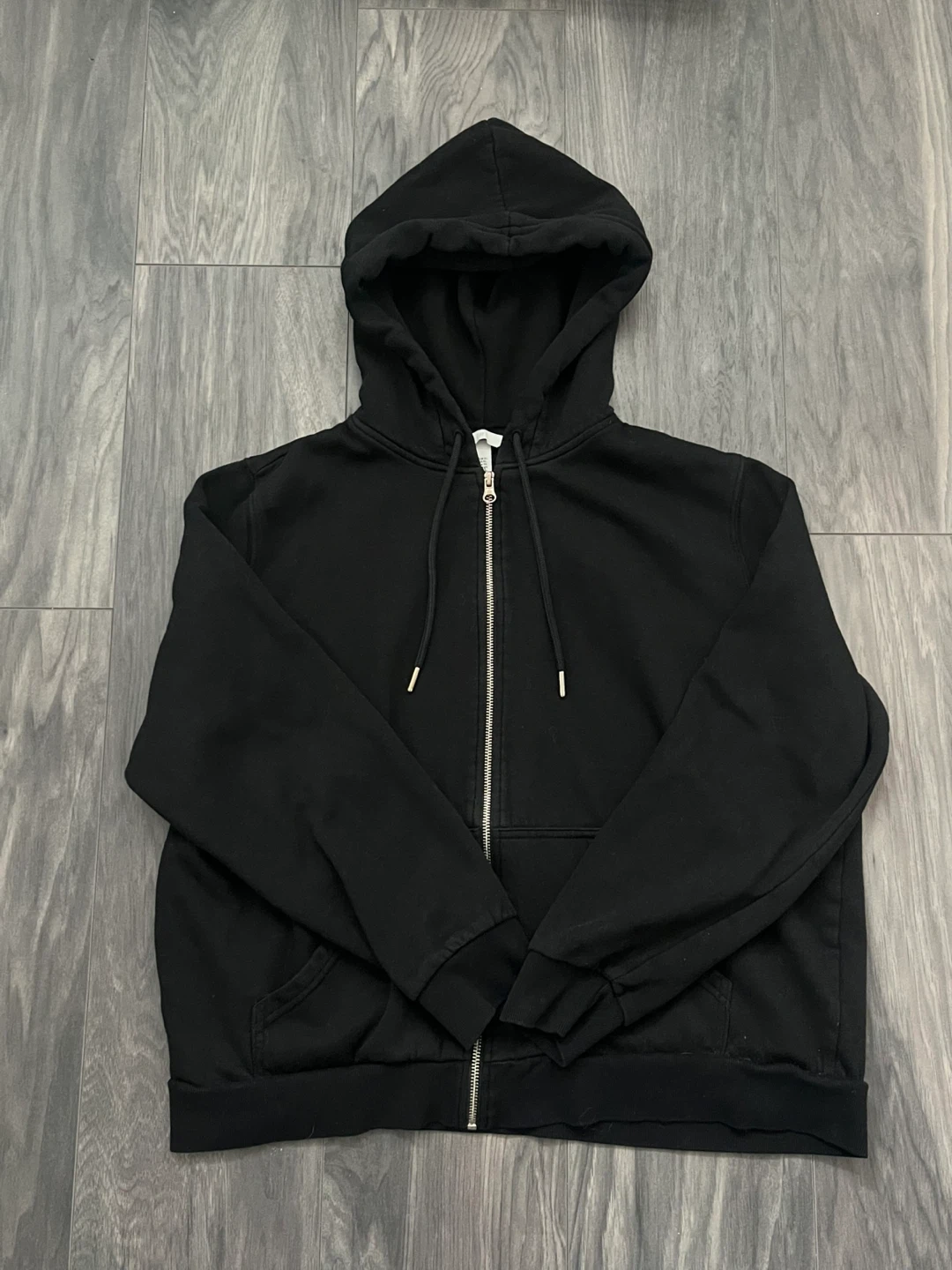 Black zip-up hoodie. Good basic staple piece. Cotton blend material. Soft and comfortable. Can be worn oversized.