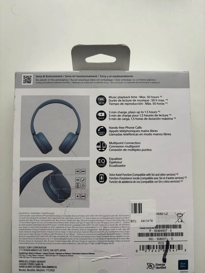 Selling a pair of Sony WH-CH520 wireless Bluetooth headphones in like-new condition. Hardly used and fully functional. Comes with original box.