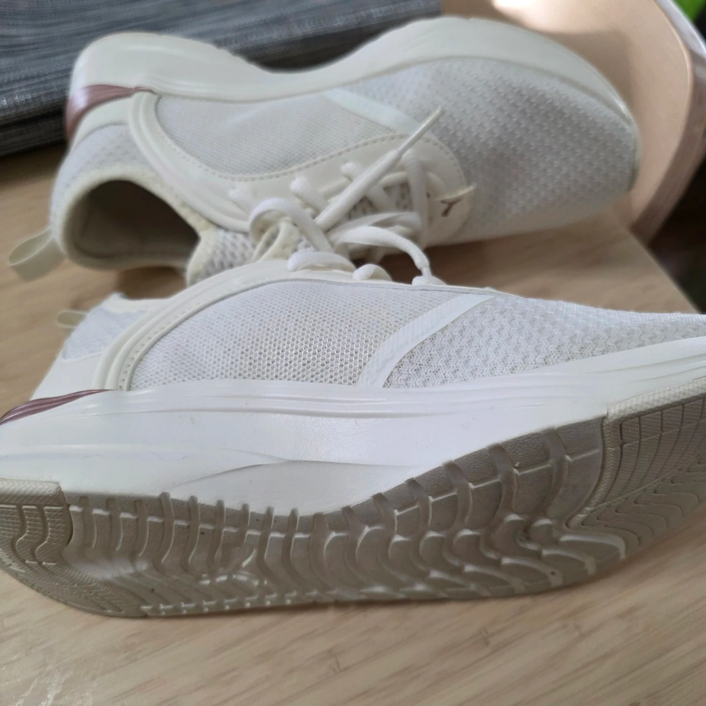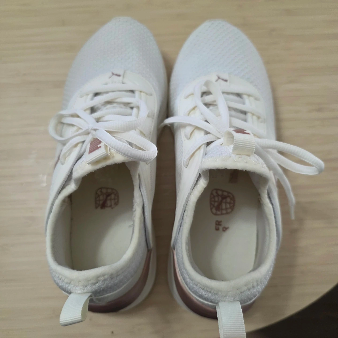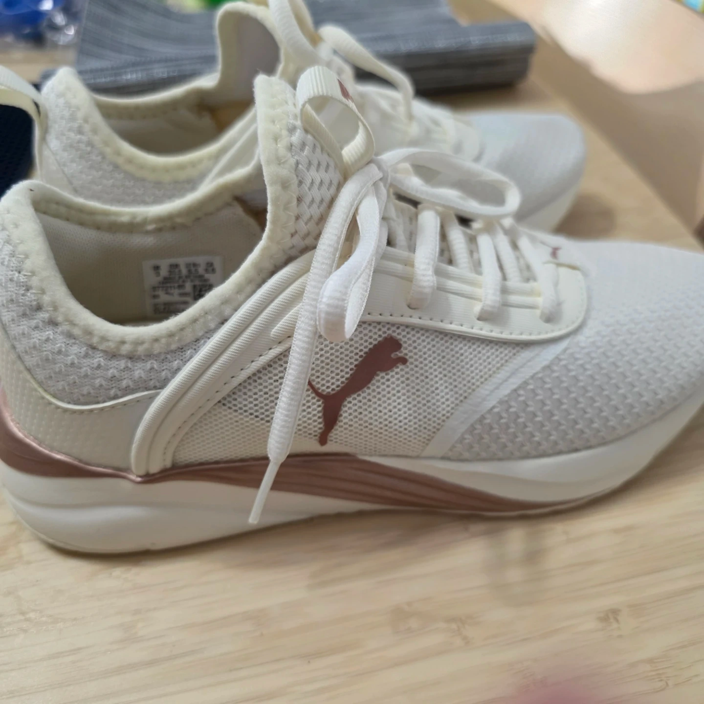 These Puma Softride running shoes are a stylish white with rose gold accents. They feature a breathable mesh upper and a comfortable Softride sole for everyday wear. Great for light jogs or walking!