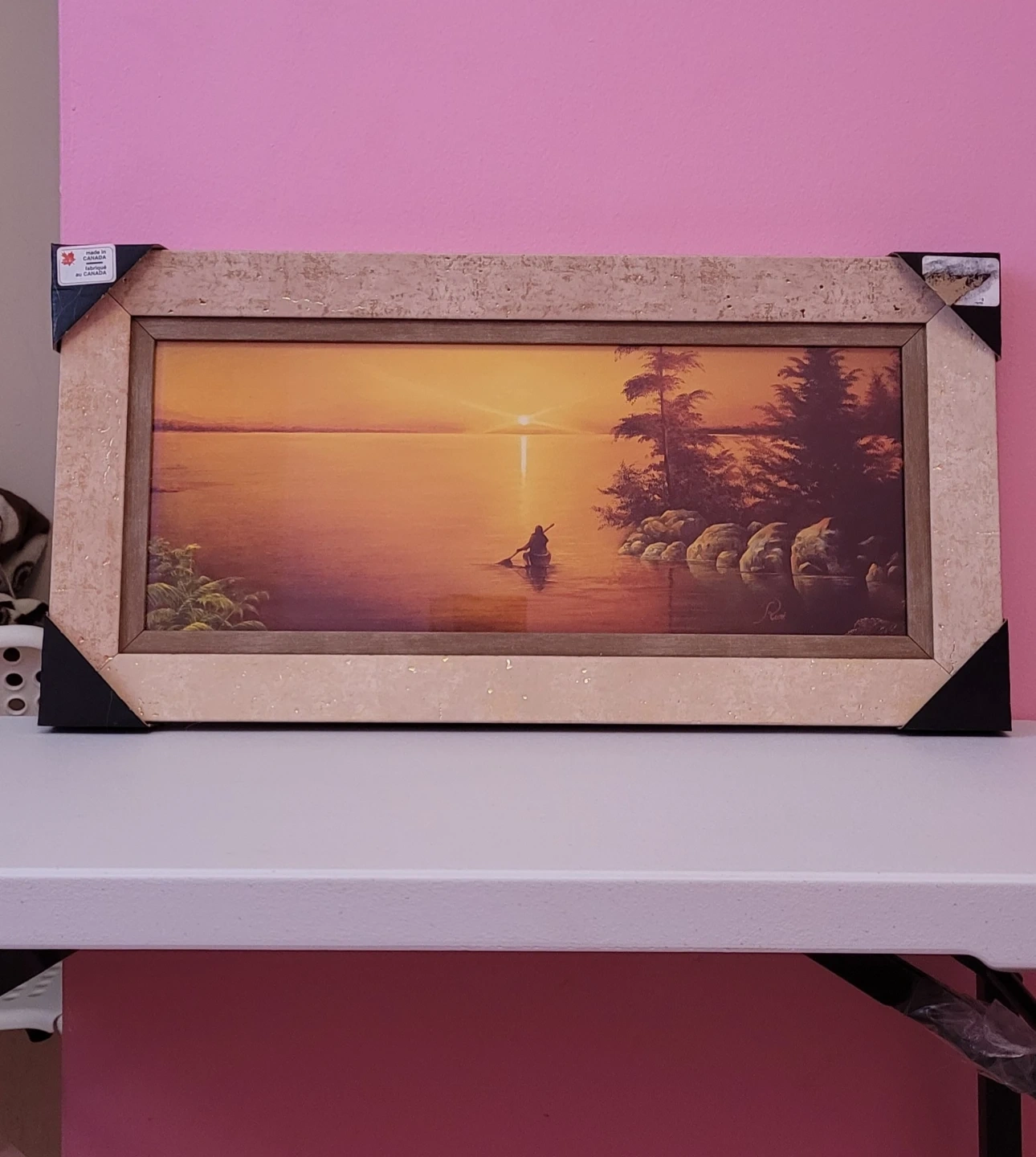 This framed art print showcases a serene sunset over a lake with a lone figure in a canoe. It's made in Canada and features a textured, neutral-toned frame. The artwork adds a touch of nature and tranquility to any room.
