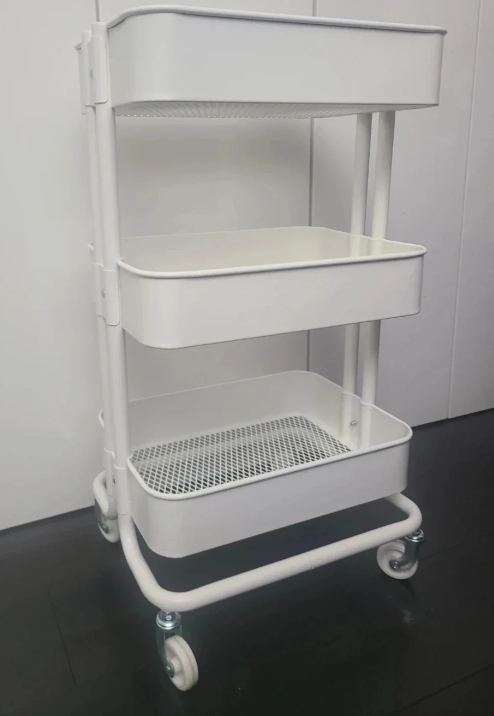 This is a white 3-tier rolling utility cart. It's made of metal with a powder-coated finish. The cart has wheels for easy movement. Perfect for organizing items in a kitchen, bathroom, or craft room!