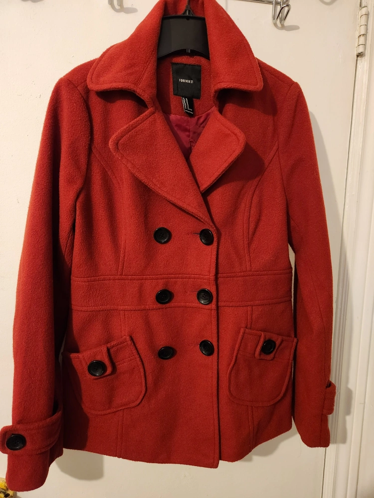 Red peacoat from Forever 21 in size medium. The coat features a double breasted closure with black buttons, two flap pockets, and a collar. Only available for pickup only.