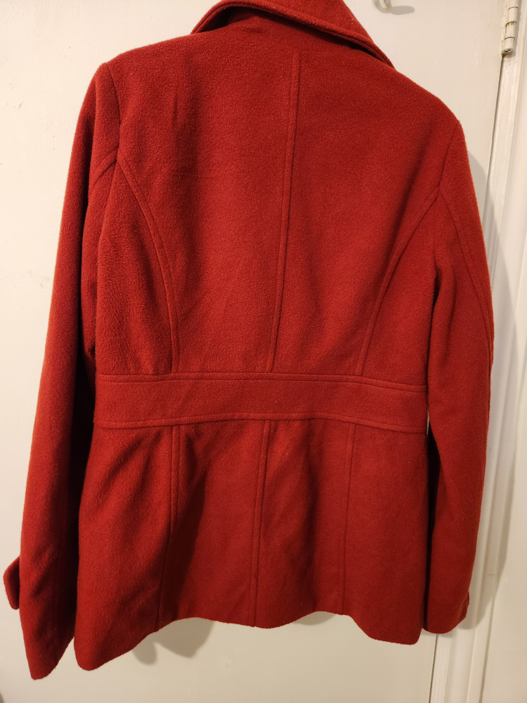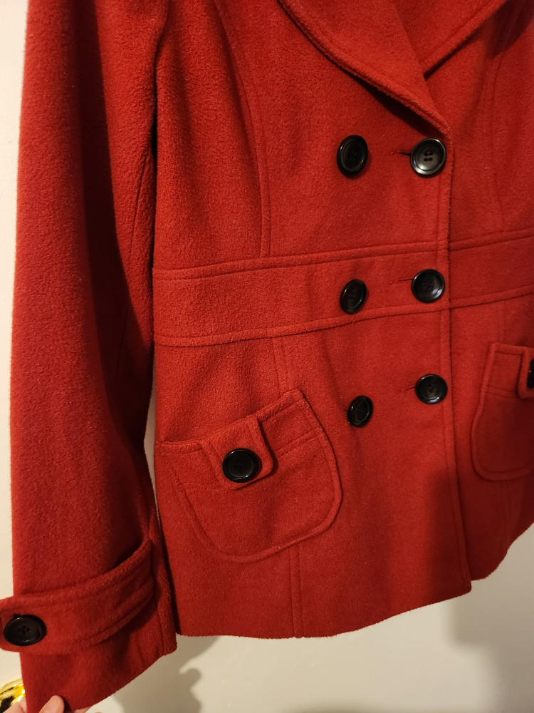 Red peacoat from Forever 21 in size medium. The coat features a double breasted closure with black buttons, two flap pockets, and a collar. Only available for pickup only.
