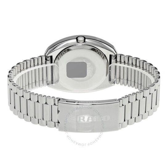 Stainless steel case with a stainless steel bracelet. Fixed stainless steeel bezel. Silver dial with silver-tone hands and index hour markers. Minute markers around the outer rim. Dial Type: Analog. Day of the week and date display at the 3 o'clock position. Quartz movement. Scratch resistant sapphire crystal. Pull / push crown. Solid case back. Case size: 35 mm. Oval case shape. Band width: 22 mm. Fold over clasp. Water resistant at 30 meters / 100 feet. Functions: date, day, hour, minute, second. Dress watch style. Watch label: Swiss Made. Rado Original Silver Dial Men's Watch R12391103.