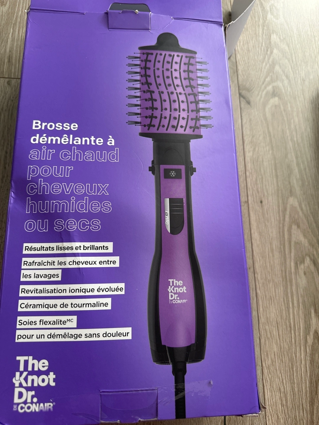 New hot air brush. Purple and black. Ionic revitalization. Tourmaline ceramic. Flexalite bristles for pain-free detangling. For wet or dry hair.