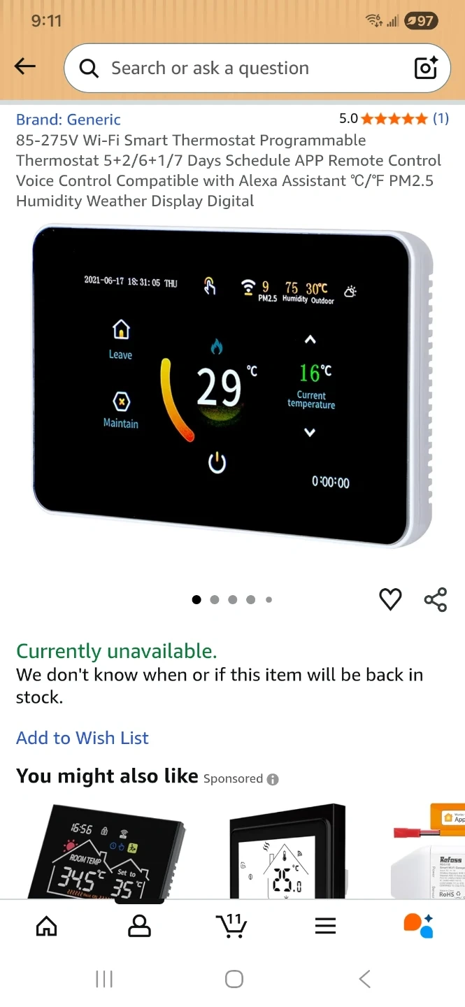 Selling a Generic Wi-Fi Smart Thermostat. Primarily for electric in-floor heating. It's programmable with a 5+2/6+1/7 day schedule and can be controlled remotely via an app. It's also compatible with Alexa and displays humidity and weather information