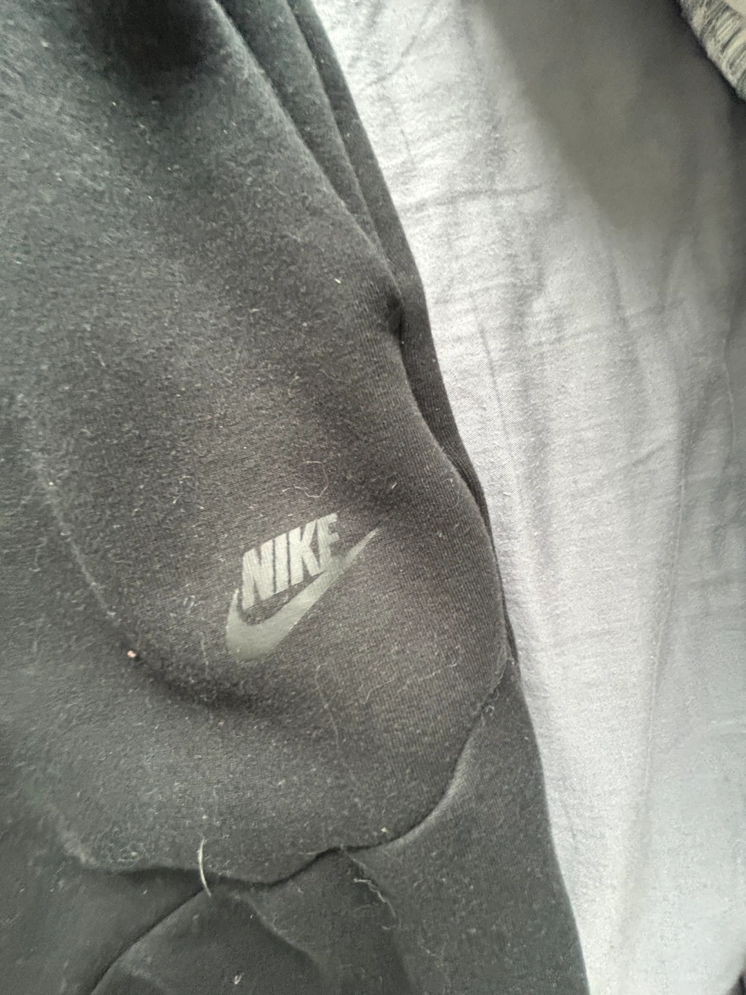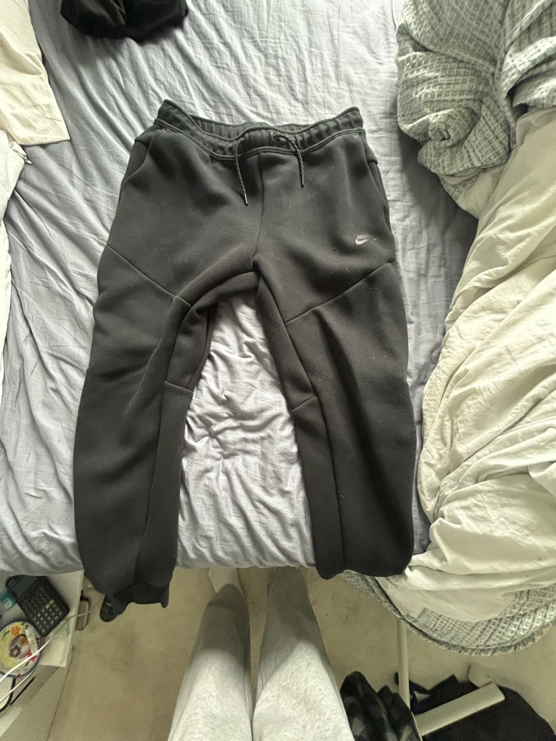 Black Nike Tech Fleece joggers. Features a drawstring waist and zipped pockets. Made from a soft, durable fabric.