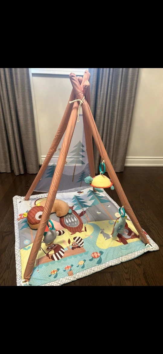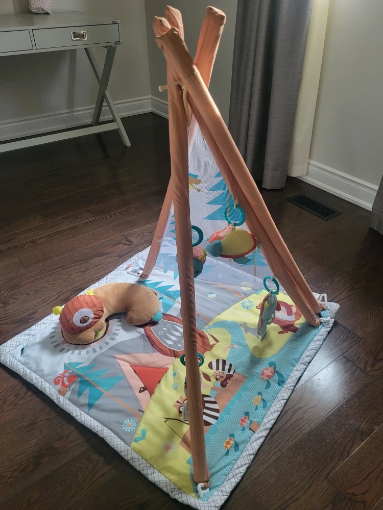This Fisher-Price play gym features a cute woodland theme with hanging toys. It includes a soft mat and a teepee-like structure with wooden poles. The play gym offers a comfortable space for babies to explore.