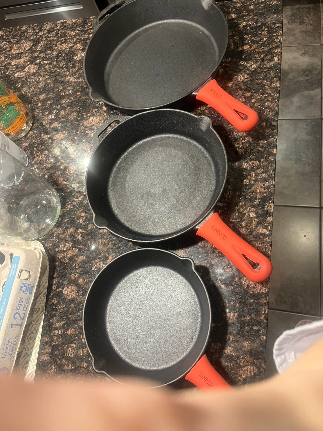 Set of three Cuisinel cast iron skillets with red silicone holders. One red holder is missing .