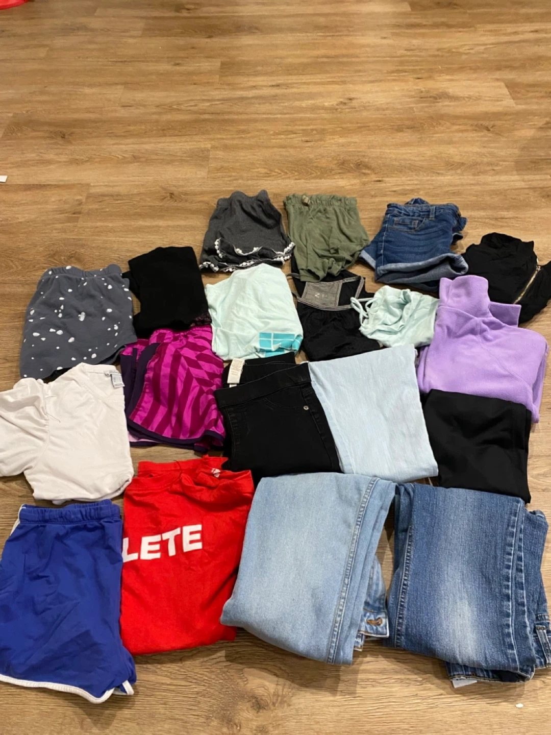A 20+ pc bundle of girls' clothing items mostly size 10-12 items (a couple of items are labelled 8-10, or 14). This bundle is a good spring/summer bundles including shorts, jeans, leggings, shirts, and a fleece top. Various colours and styles. Please refer to the pictures for more details on condition and styles. Perfect for everyday wear or active days!