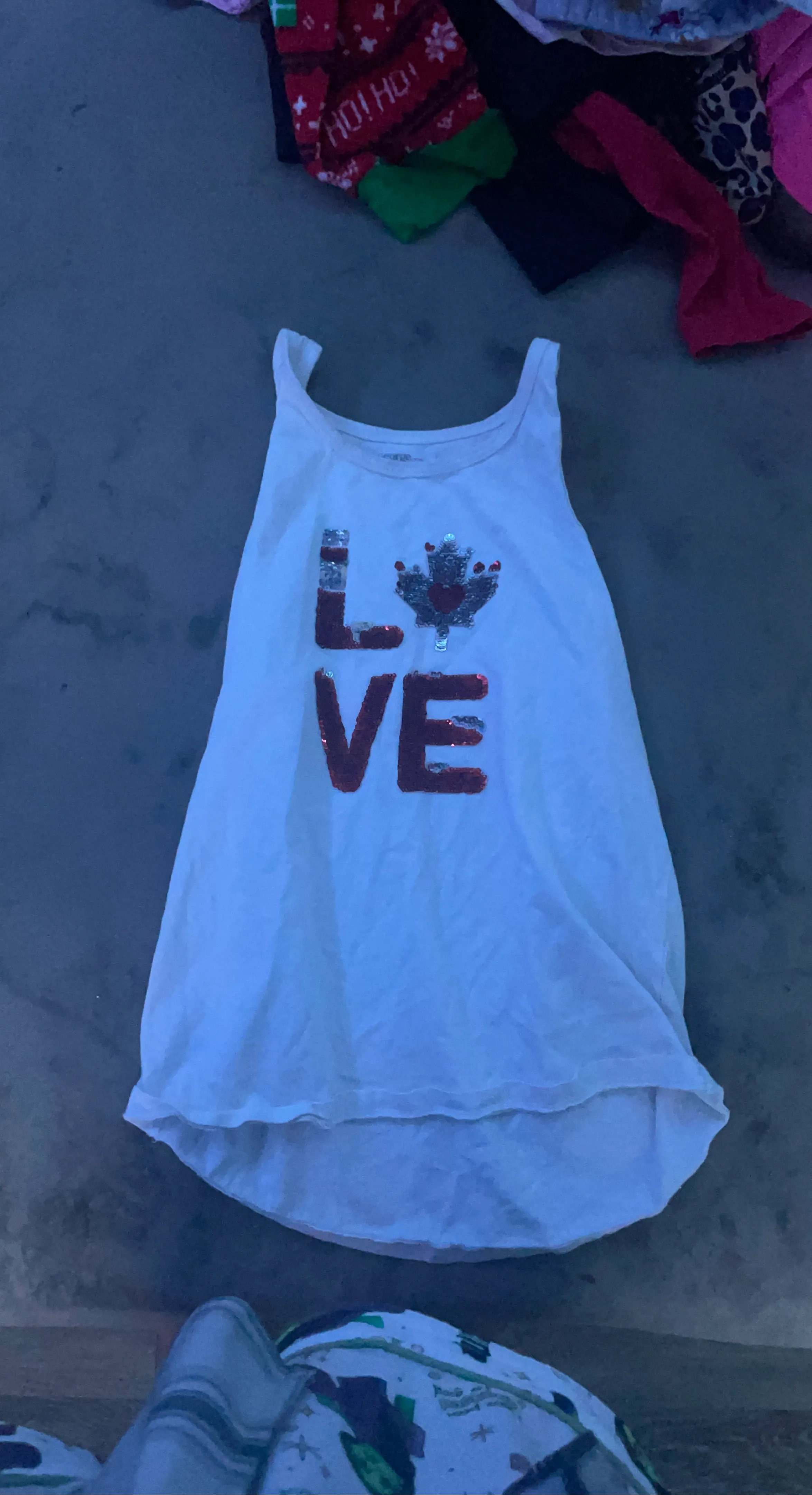 This white tank top features a "LOVE" graphic with red sequin letters and a sequined Canadian maple leaf. It's a fun, casual piece. Made of soft cotton blend material.