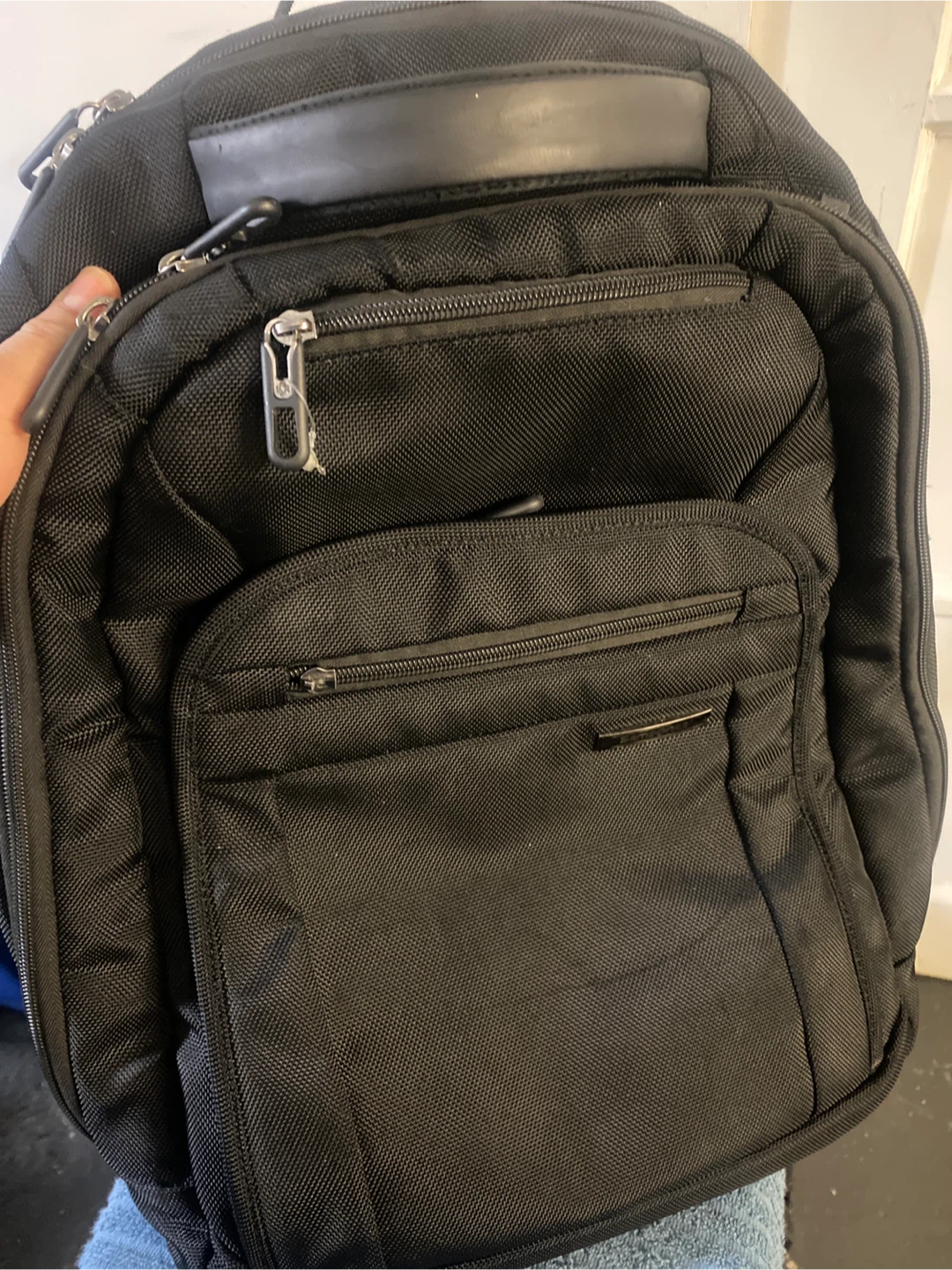 This is a black Samsonite Laptop backpack with multiple zippered compartments. It's made of durable fabric. This bag is great for school, Business or travel!