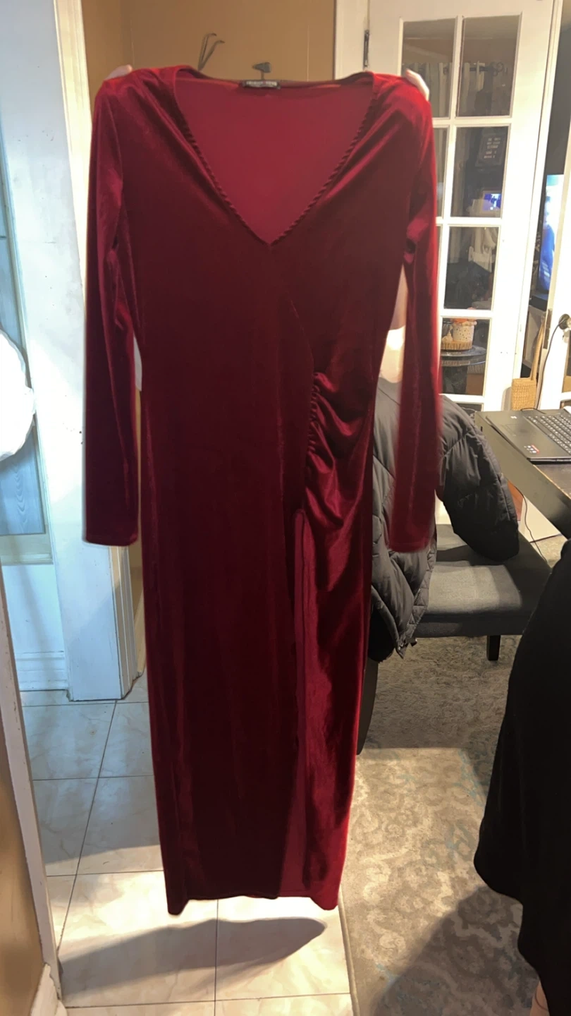 This is a long-sleeved red velvet dress. It features a V-neckline with braided trim and ruching on the side. Material is soft velvet. #freecycle