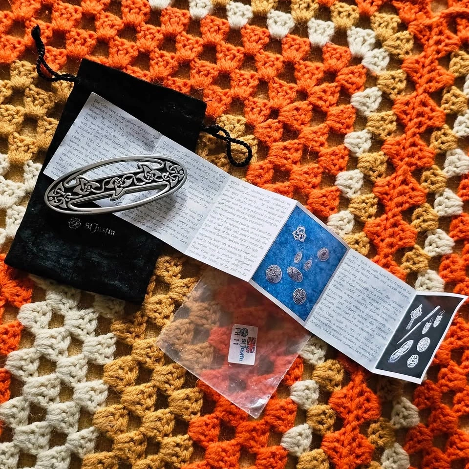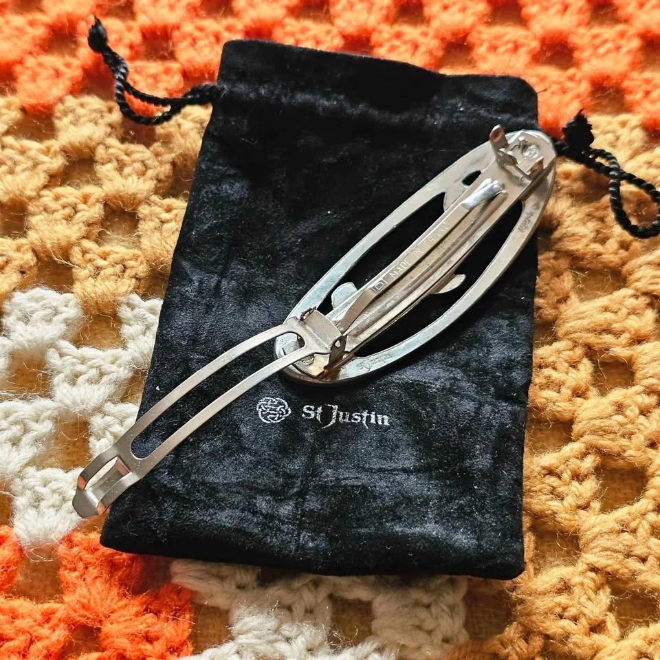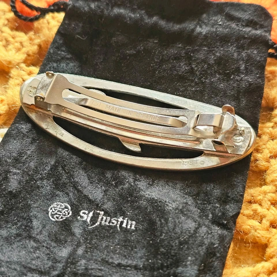 A true collector's piece! Original 1994 vintage Ivy Leaf Celtic Knot hairslide/ barrette hairclip, made in France by St. Justin. Early production made of heavy pewter with a beautiful patina. Comes with its original black velvet bag and mini St. Justin infobook.