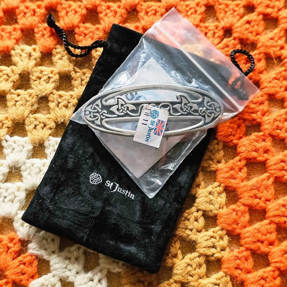 A true collector's piece! Original 1994 vintage Ivy Leaf Celtic Knot hairslide/ barrette hairclip, made in France by St. Justin. Early production made of heavy pewter with a beautiful patina. Comes with its original black velvet bag and mini St. Justin infobook.